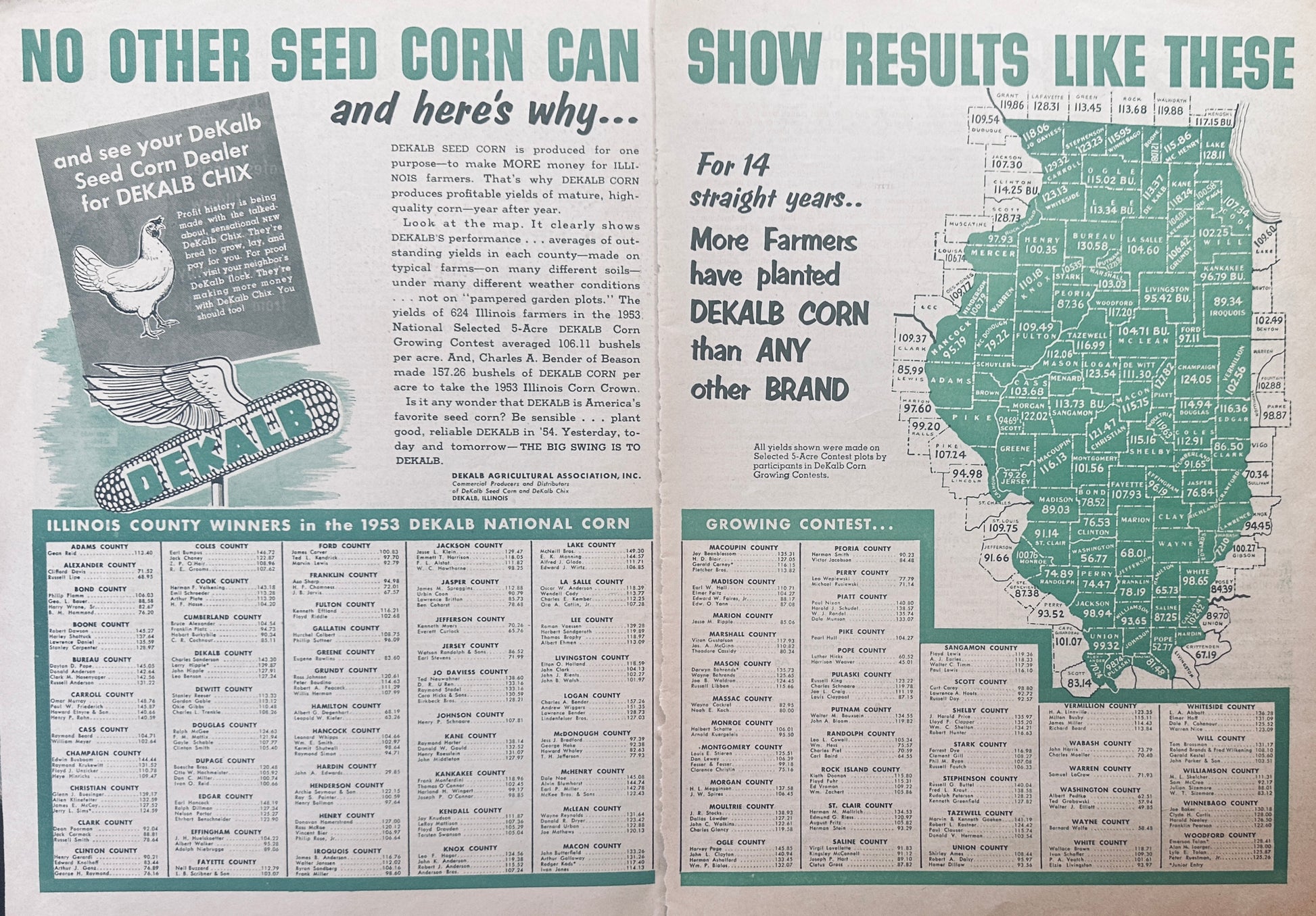 This original 2-page magazine ad measures @ 13 x 20" when carefully aligned and fully open as shown in the image. The ad showcases the yield results in the 1953 Dekalb Corn growing contest across Illinois for that time period.