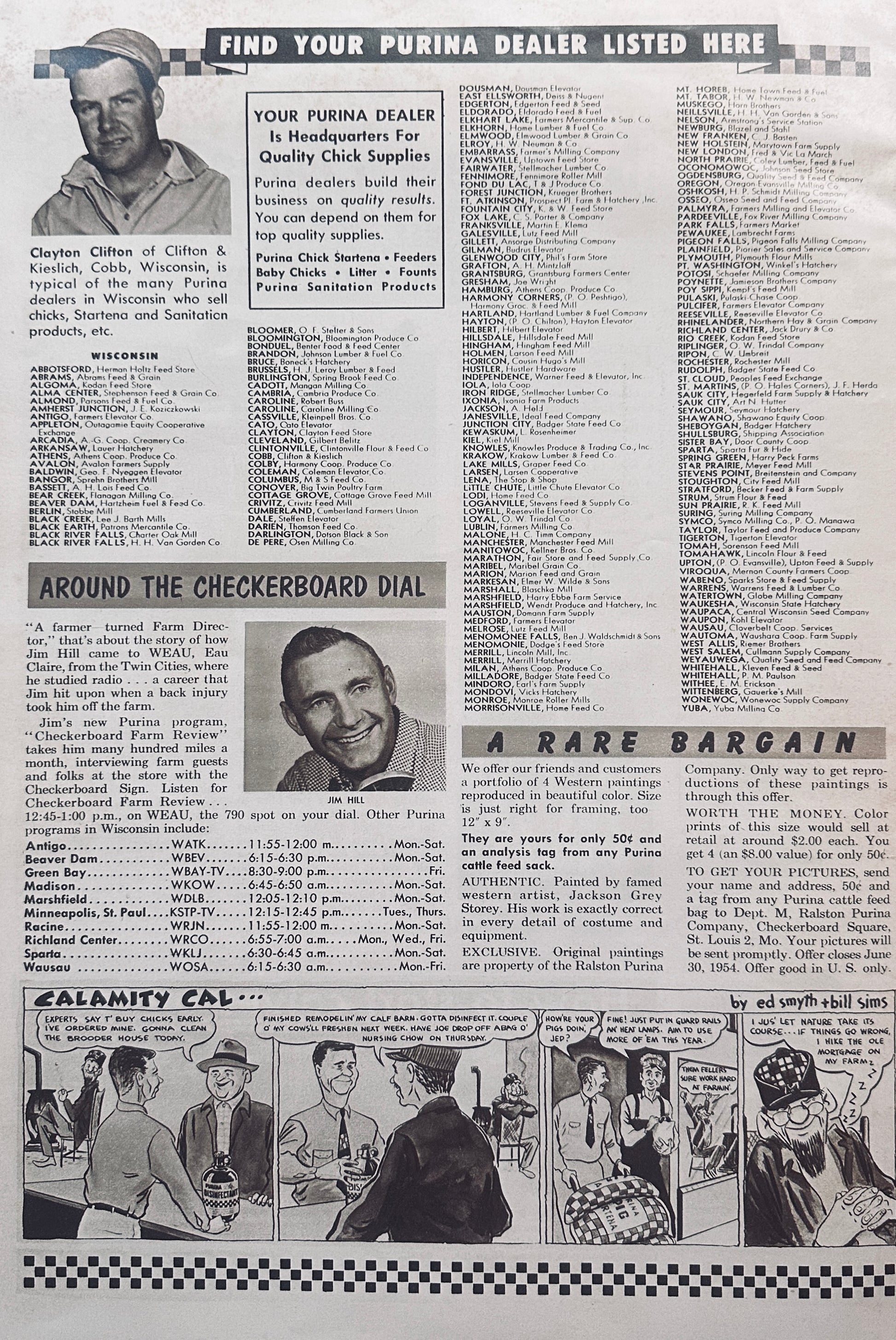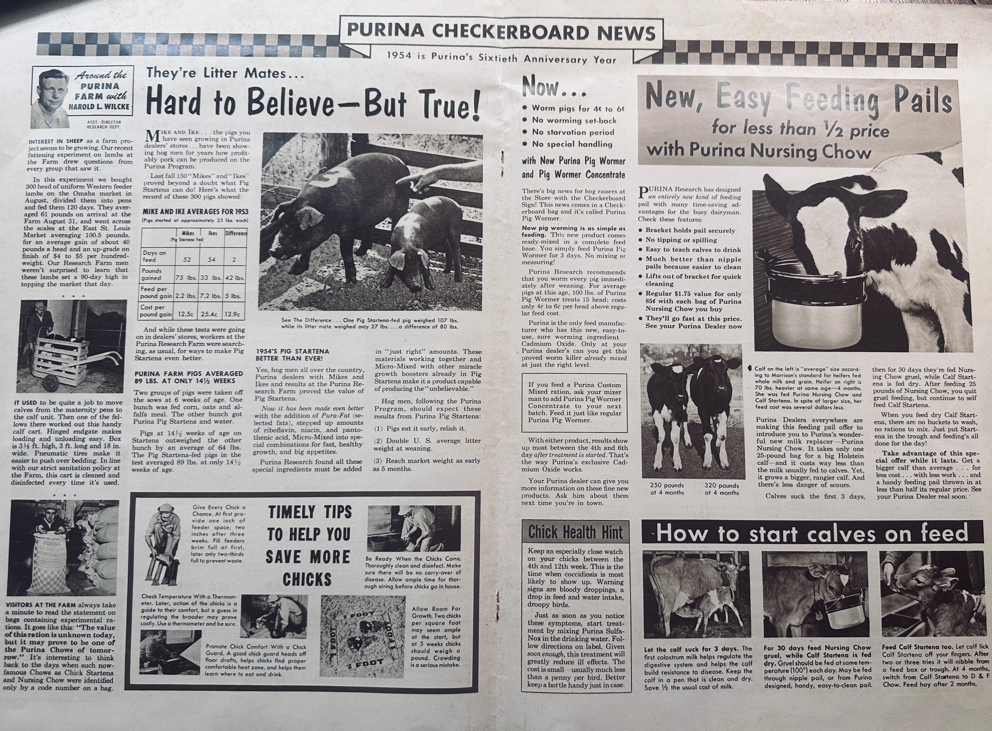This original 13 x 20" double sided centerfold magazine insert from 1954 provided 4 pages of Purina Checkerboard New from around the Midwest while promoting their line of livestock feeds and dealerships. It even mentions the name of my local Wisconsin Feed mill in 1954, which sadly is no longer here. Great pieces of Agricultural History and a snapshot of an era gone by.
