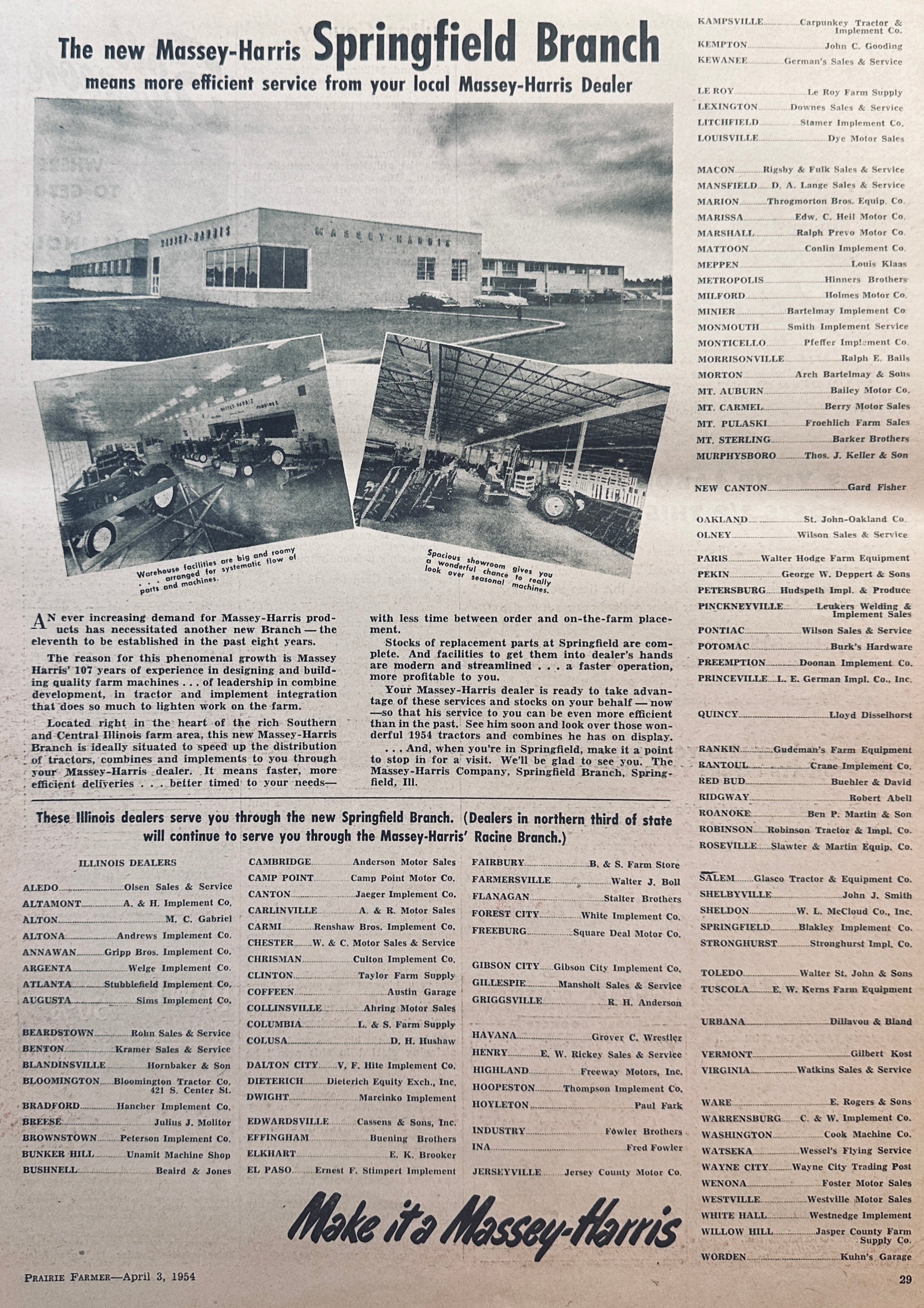 This original 10 x 13" magazine ad from 1954 introduces the latest Branch operation of Massey-Harris in Springfield, IL, featuring exterior and interior photos of the building when it opened.