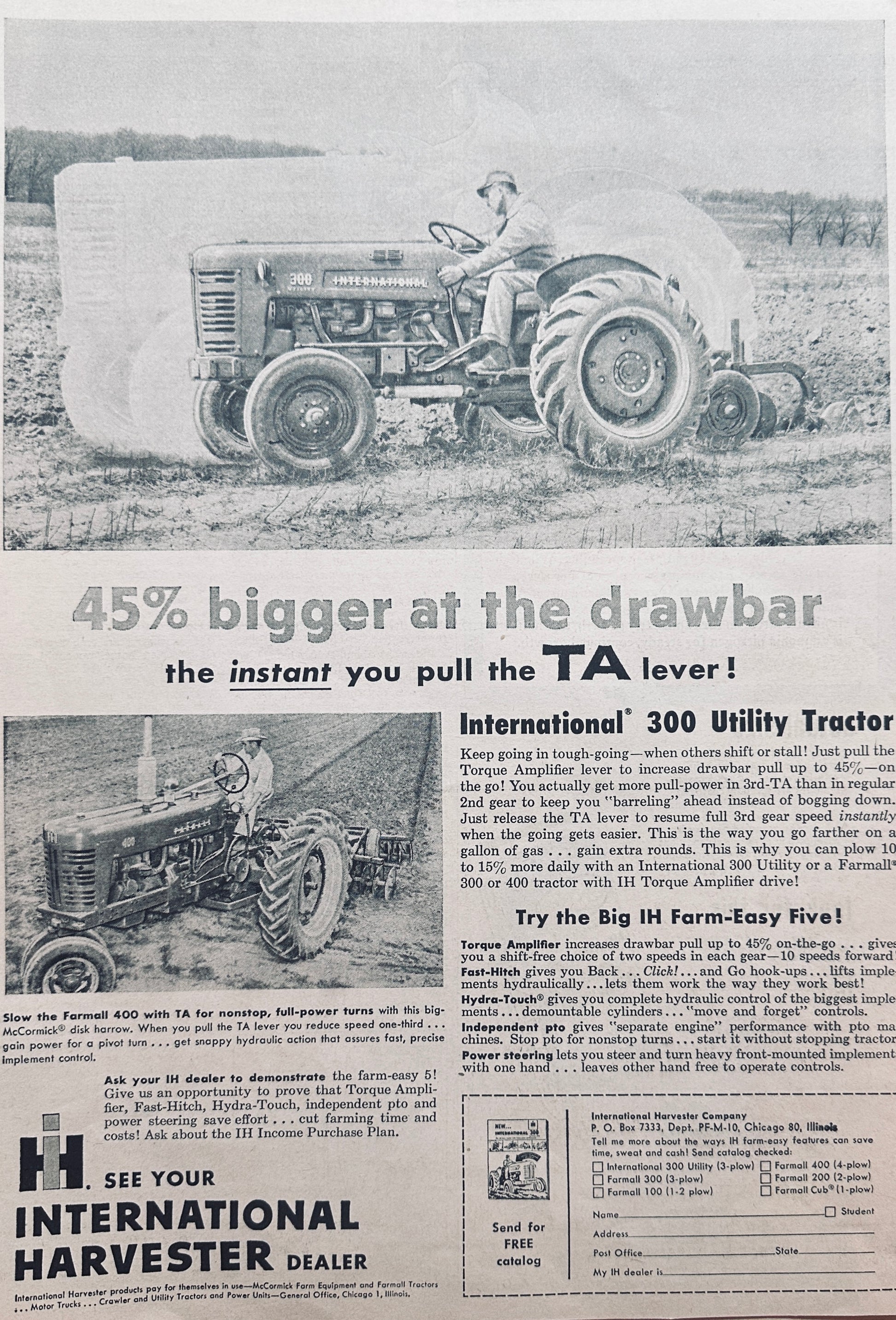 This original 10 x 13" magazine from 1956 explains the Torque Amplifier (TA) and how it improves performance on tractors equipped with it. The ad shows an IH 300 Utility Tractor with TA.