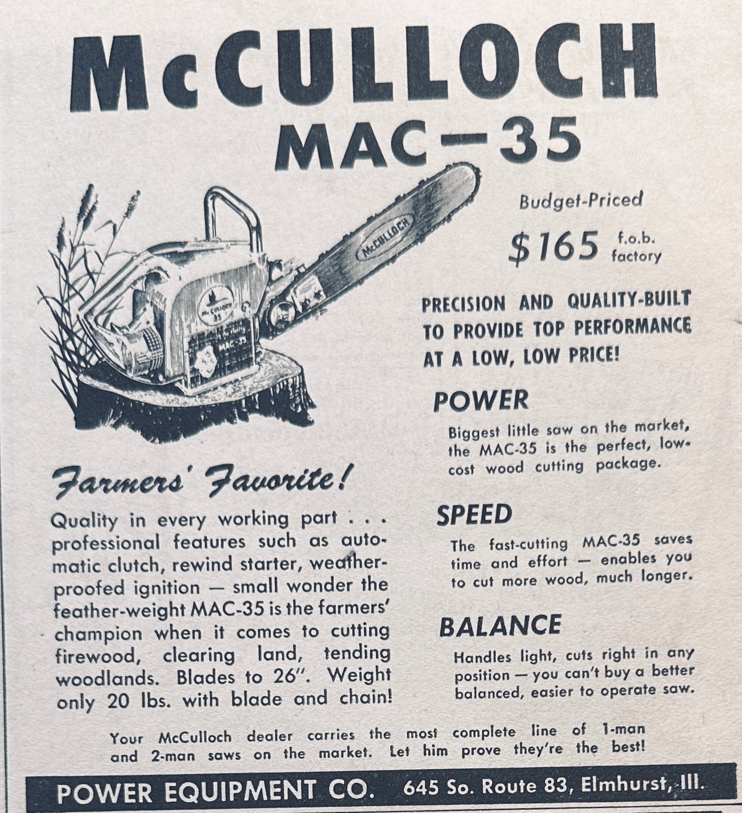 This lot of (2) McCulloch Chain Saw ads each feature the D-Series of Chains saws. The first ad is @ 5 x 5" and showcases the MAC-35 of 1957. The second ad is @ 5 x 13" and showcases the Mac D30, MAC D36, MAC 35A, Super 44A and Super 55A of 1959. Both ads are untrimmed from their 10 x 13" master pages.
