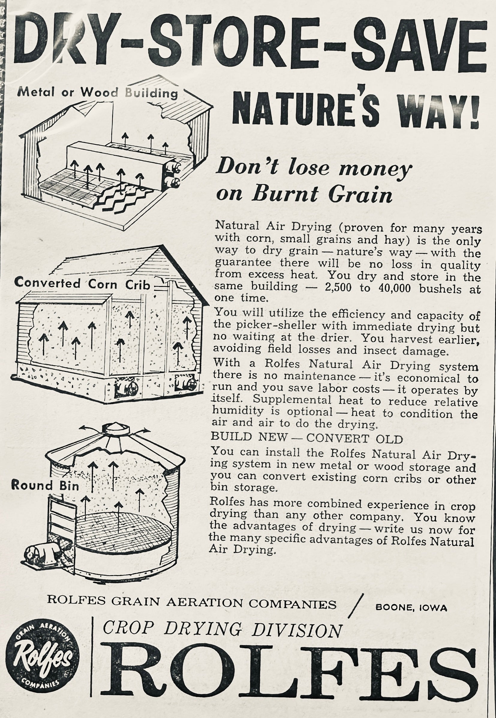 This original magazine ad has been trimmed to @ 4 x 6" and showcases Grain Drying and Storage buildings produced by Rolfes Crop Drying Division out of Boone, Iowa.