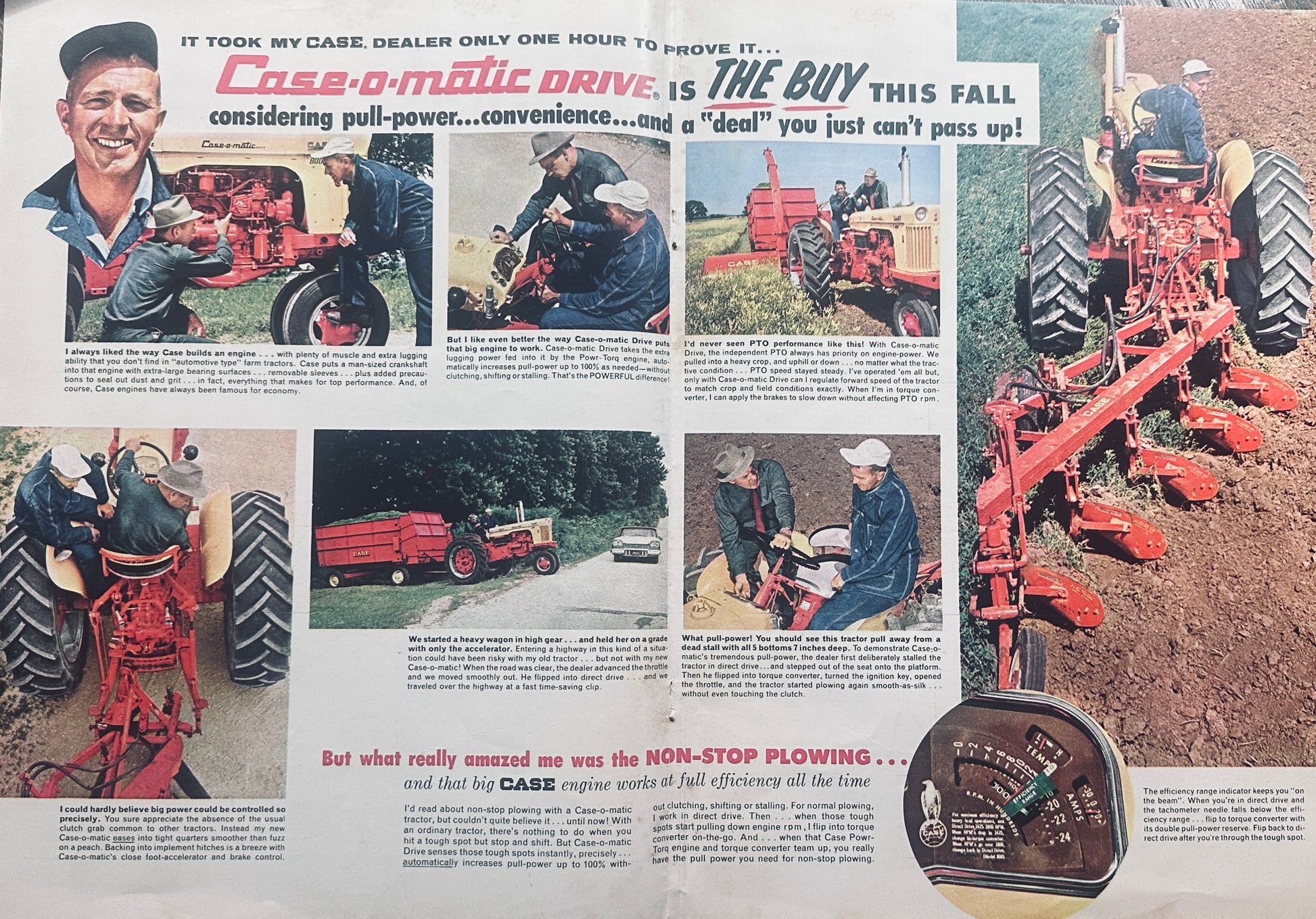 This original 13 x 20" double sided centerfold ad from 1959 features the Case-o-Matic Drive tractors. The first image shows the front and back pages of the ad when closed, and the second image shows the interior pages when open. All sides are still bright and crisp and features the line of Case tractors of 1959 in 12 power size with 124 models in total available to demo.