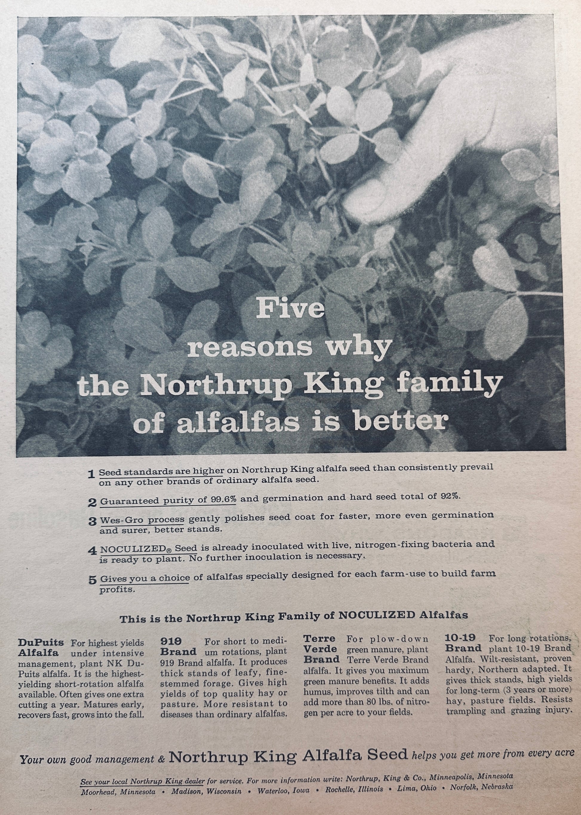 This original lot of (2) Northrup King Seed ads each measure 10 x 13" and are dated 1959. The first promotes the company's Alfalfa Seed, and the second its Hybrid Corn Seeds available throughout the Midwest.