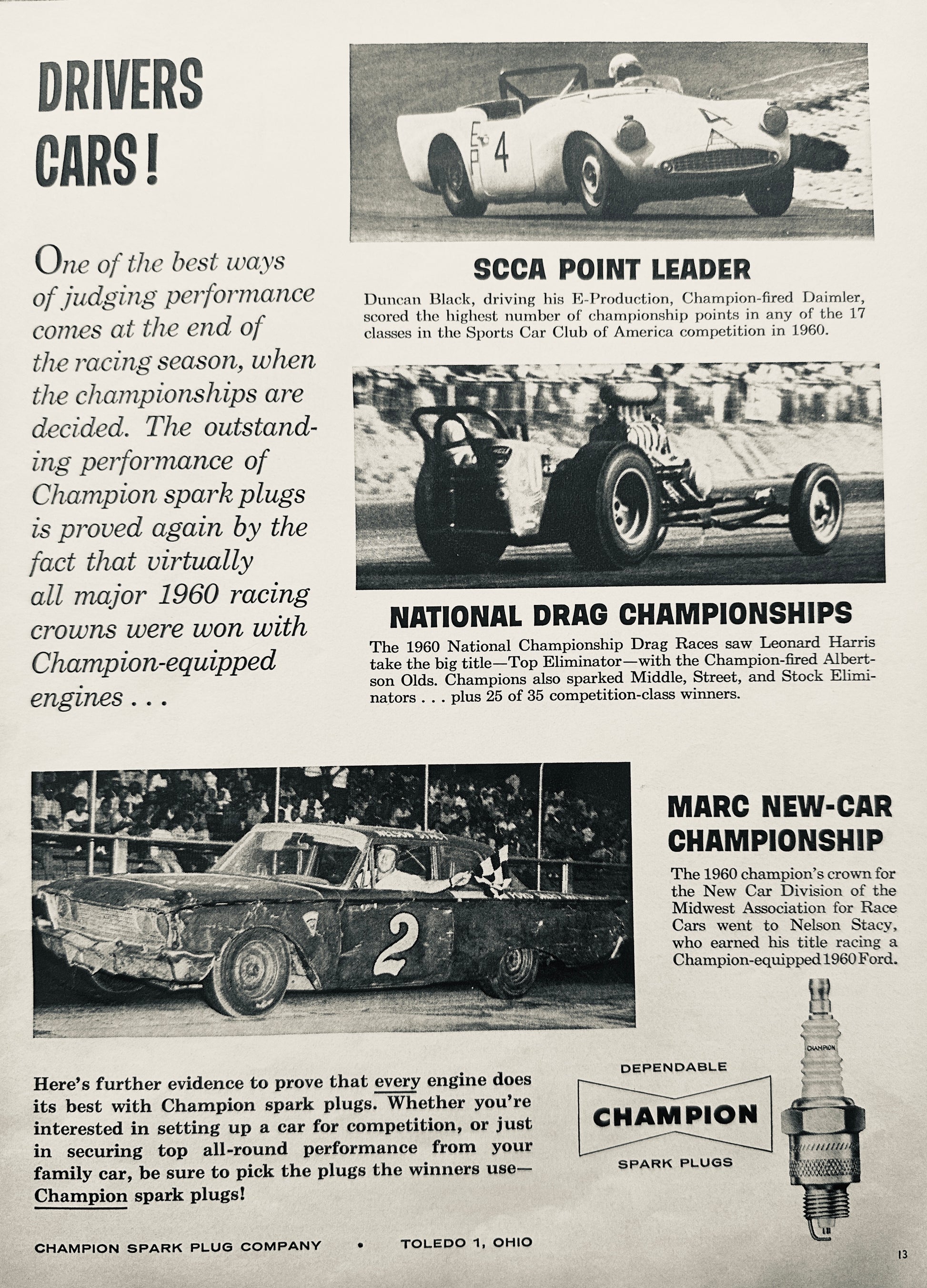 This original 8.5 x 11" magazine ad from 1961 showcases the fact the winners across lots of different racing specialties powered their vehicles with Champion Spark Plugs.