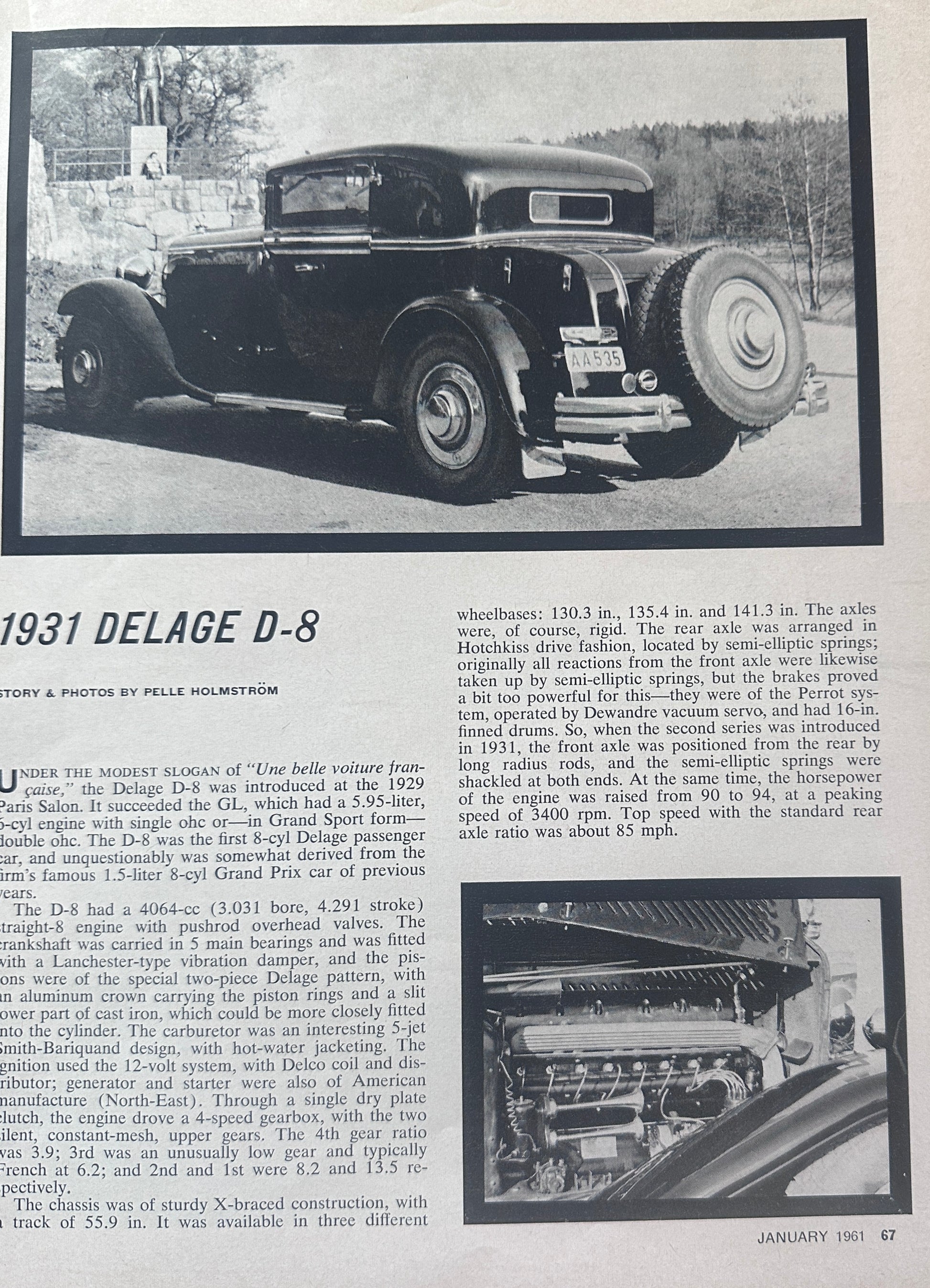 This original magazine feature article was published in 1961 on 8.5 x 11" pages. It is 4 pages in length and has several outstanding photos of the 1931 Delage along with performance and appearance details. Not all pages are shown. the Delage D-8 was made in France.