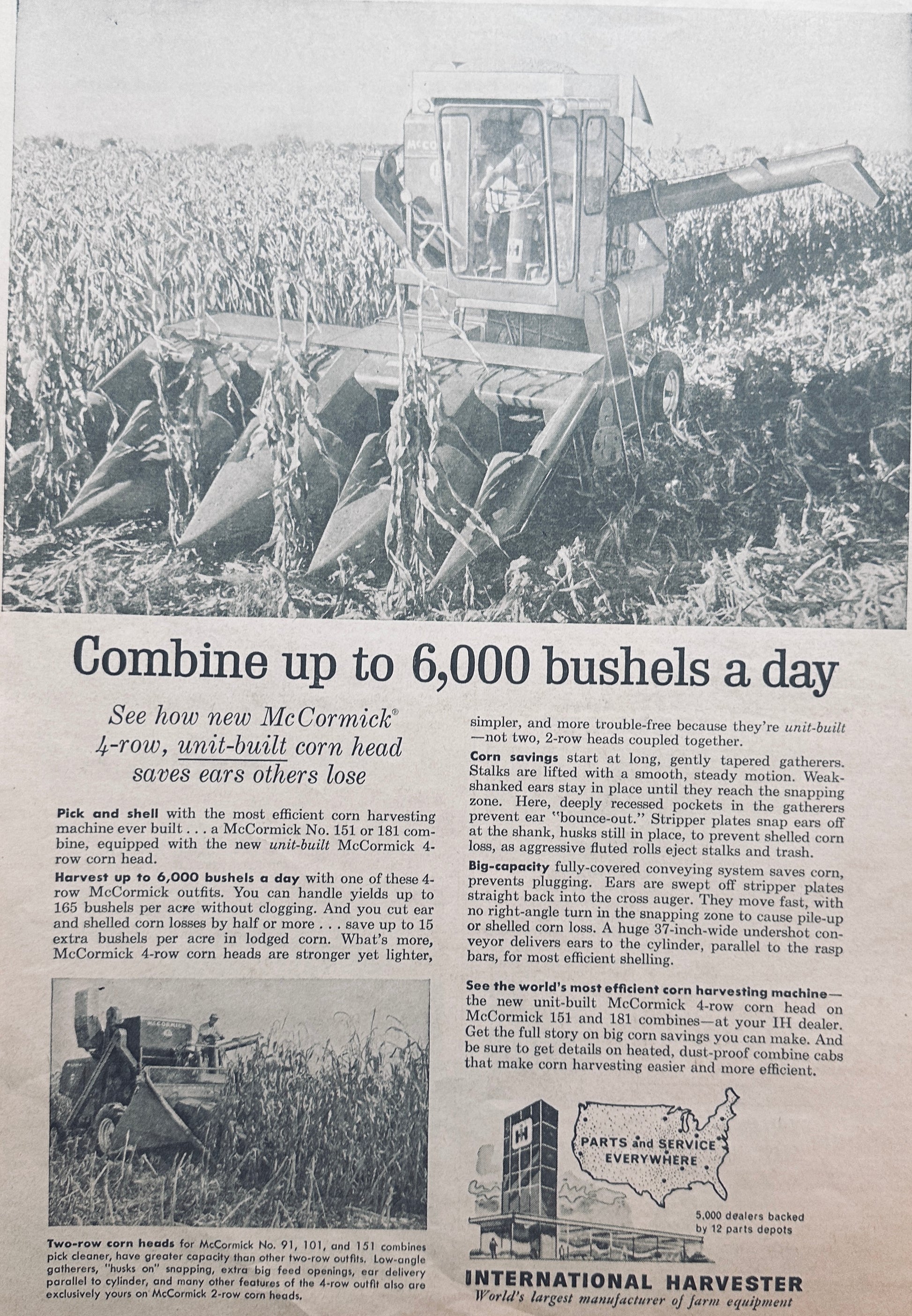 This original 10 x 13" magazine ad showcases the International Harvester line of McCormick 4 Row Corn Heads no 151 & 181 along with 2-Row models NO 91, 101 and 151 for 1961.