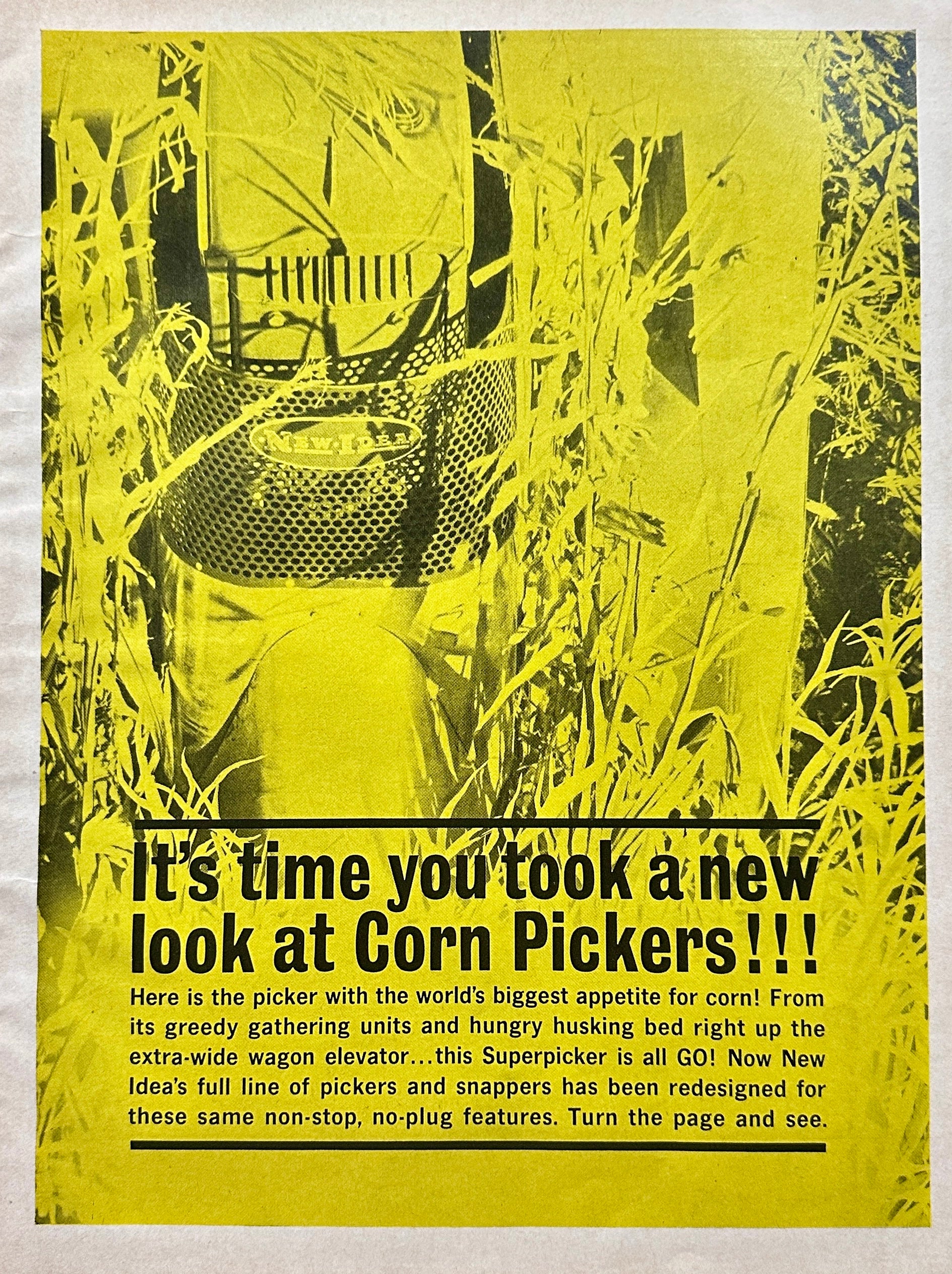This original 2 page magazine ad is actually printed on 3-sides as shown in the images. The 1962 ad features New Idea Corn pickers and measures 10 x 13" when closed and 13 x 20" when carefully aligned and fully open. The 1st image shows the cover page, the 2nd image shows the center pages when open and aligned for display.