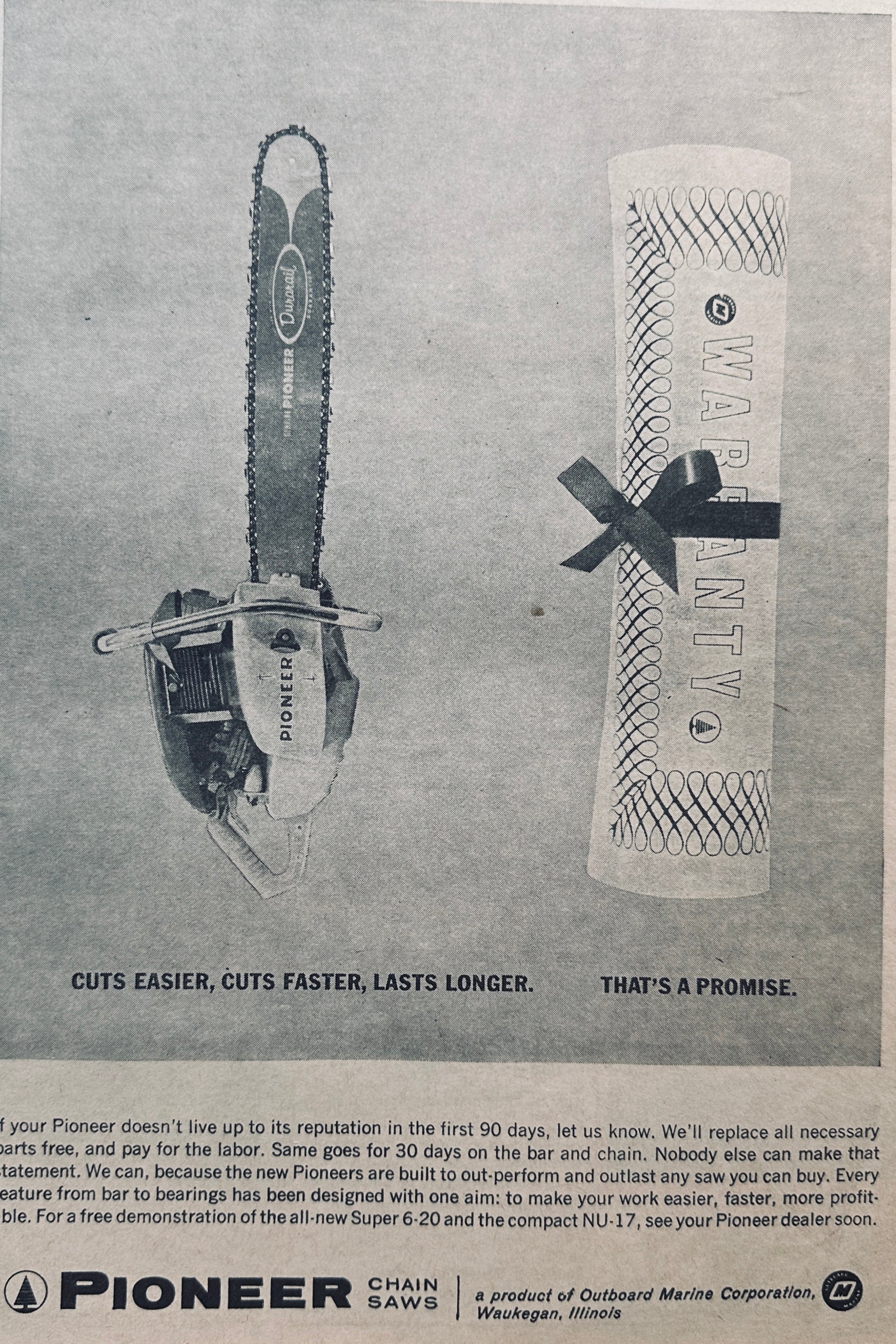 This original 8.5 x 11" magazine ad comes untrimmed from its larger 10 x 13" page. The ad is dated 1962 and features the Pioneer Chain Saw Model the Super 6-20 and the NU-17 being demonstrated by your local dealerships and offering product warranties as well.