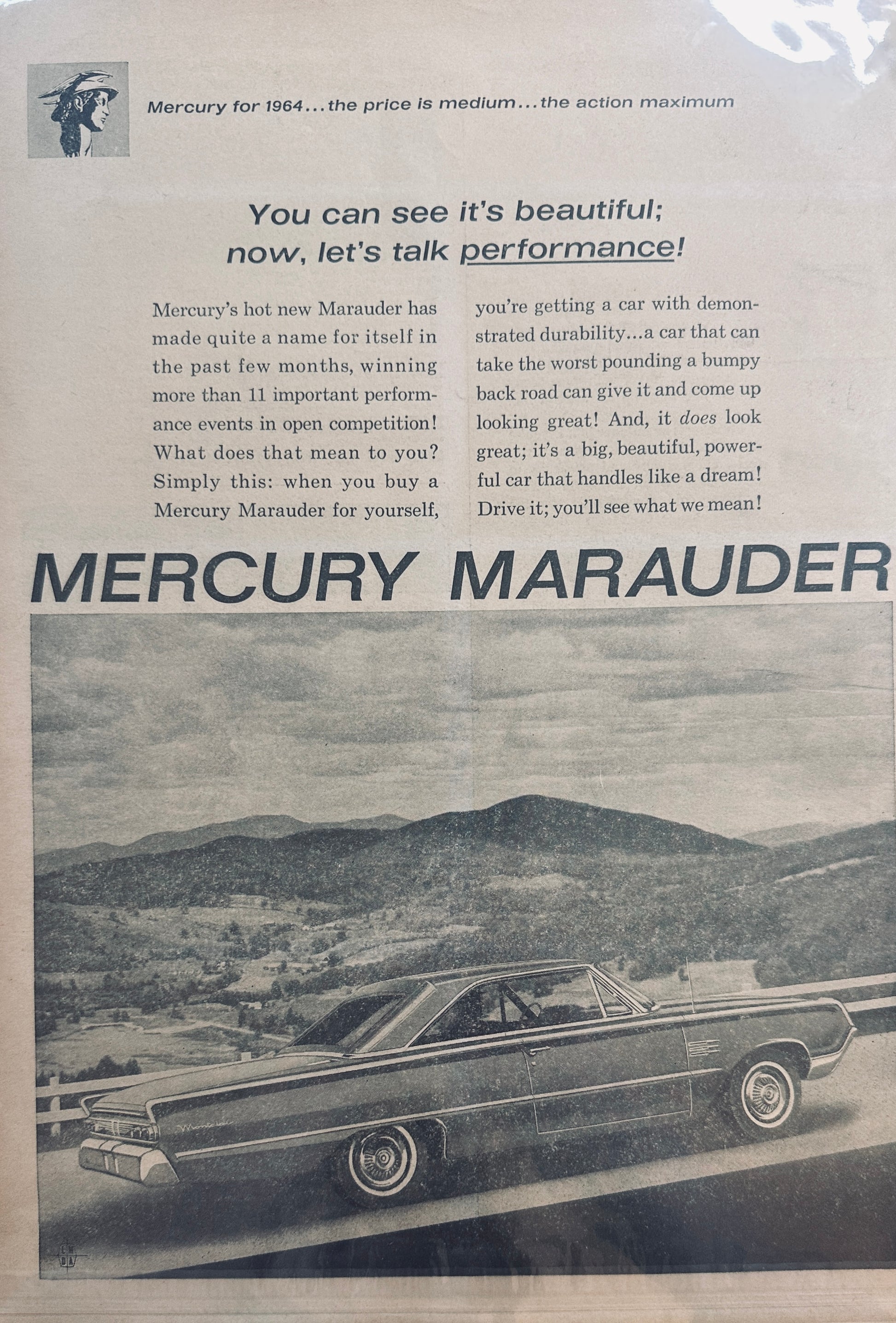 This original 10 x 13" magazine ad features the 1964 Mercury Marauder. The ad was released in late 1963. The page patina has yellowed. Still a Classic Ad though.