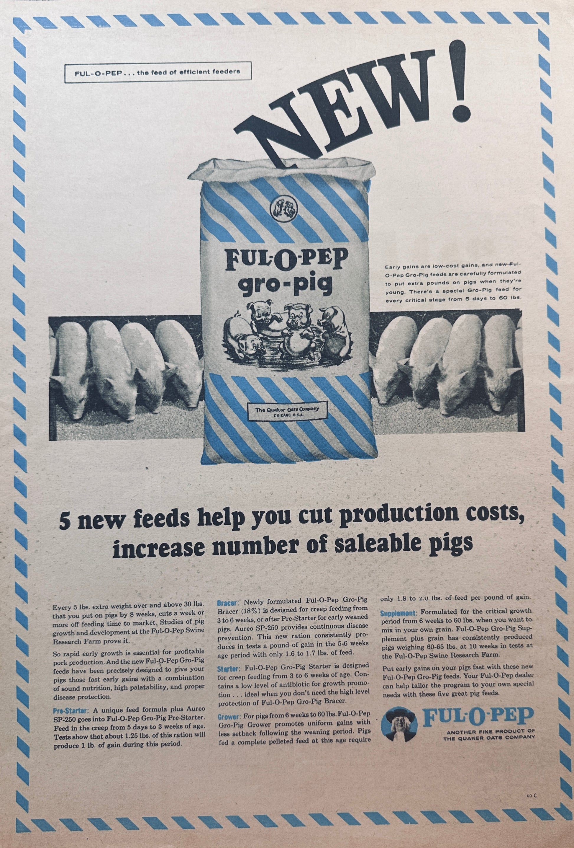 This 1965 original 10 x 13" magazine is a real cutie! It features the Ful-O-Pep Gro-Pig Feeds with 5 new varieties for 1964. Ful-O-Pep was a product of the Quaker Oats Company!