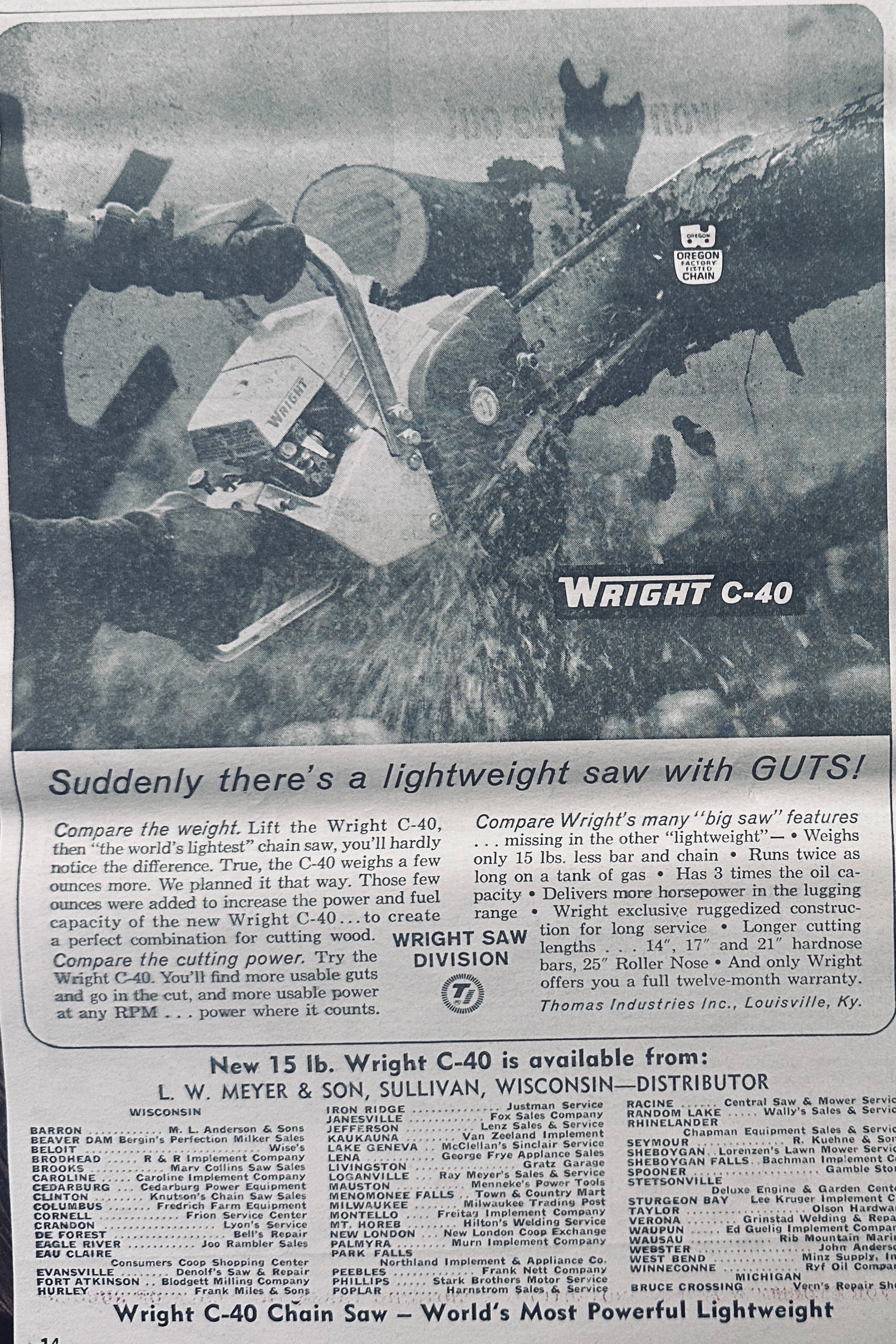 This original 8.5 x 11" magazine ad comes untrimmed from its larger 10 x 13" page to feature the 1965 Wright C-40 lightweight chain saw of 1965. The ad also provides a list of Wisconsin Dealerships for that period.