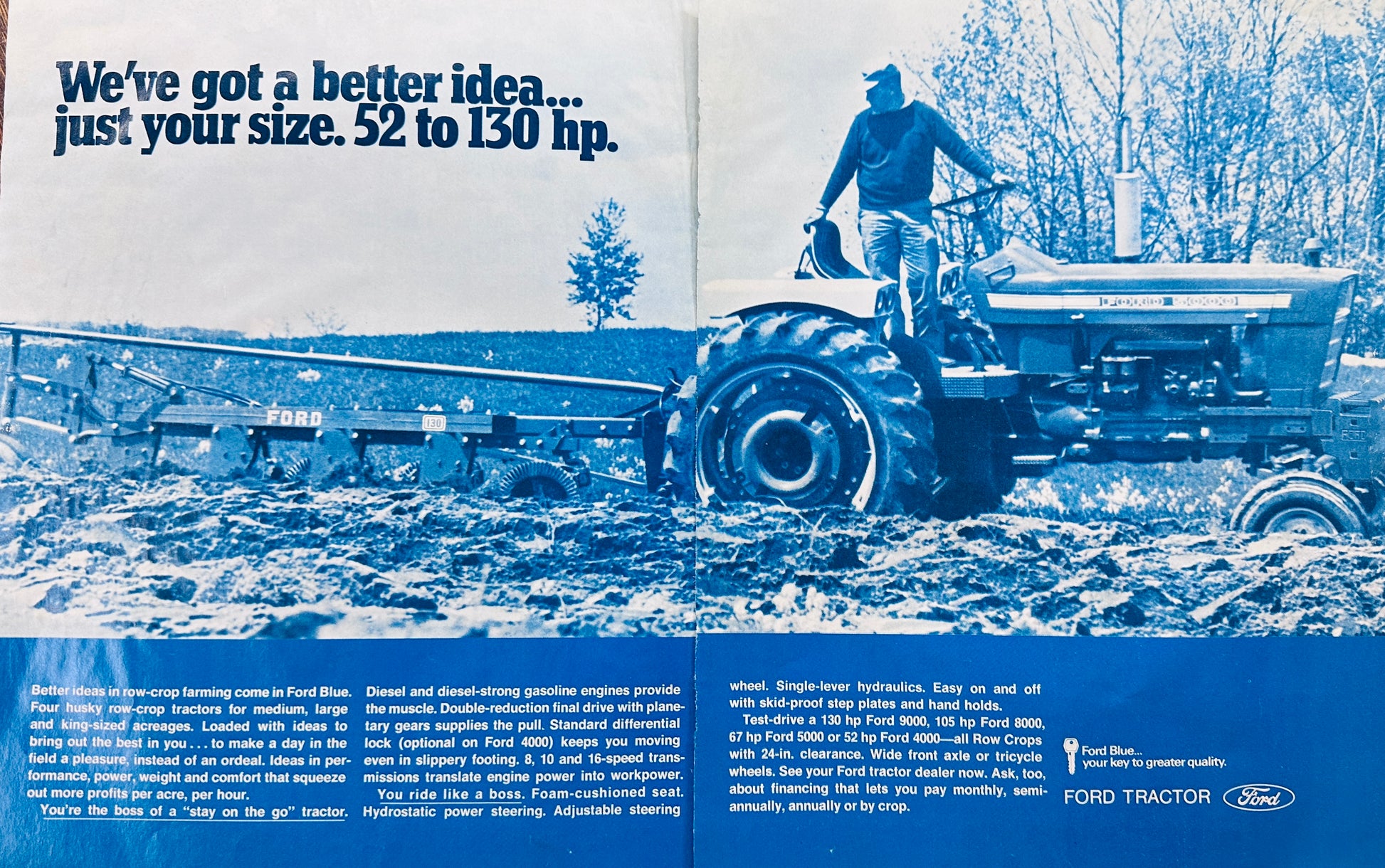 This original 2-page magazine ad dates from 1970 and measures @ 13 x 20" when carefully aligned and fully open as shown in the image. It features the Ford Row Crop Tractors for 1970 on a denim washed background.