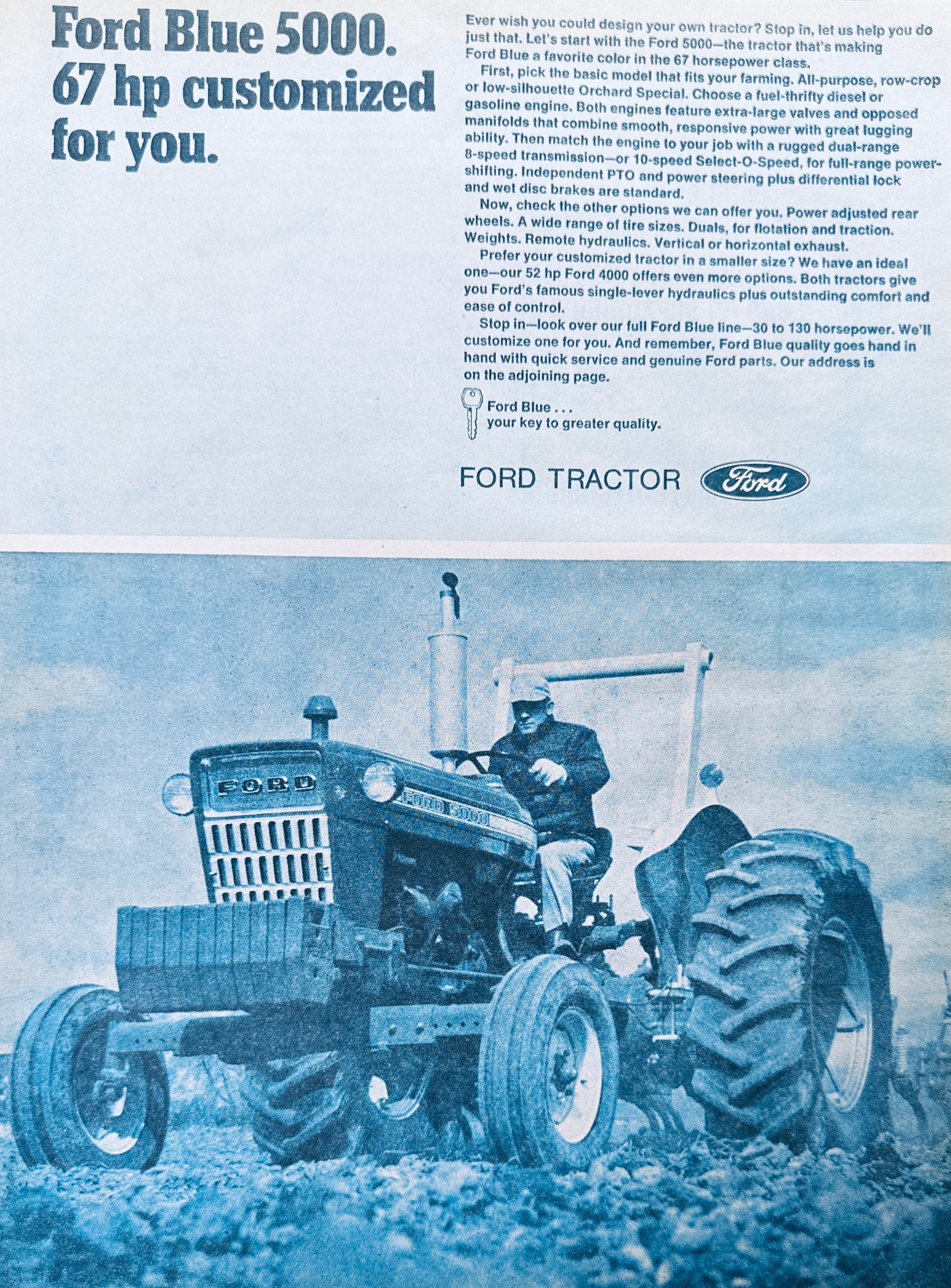 This original 10 x 13" magazine ad from 1971 features a Ford Blue 5000 67Hp Customized Tractor.