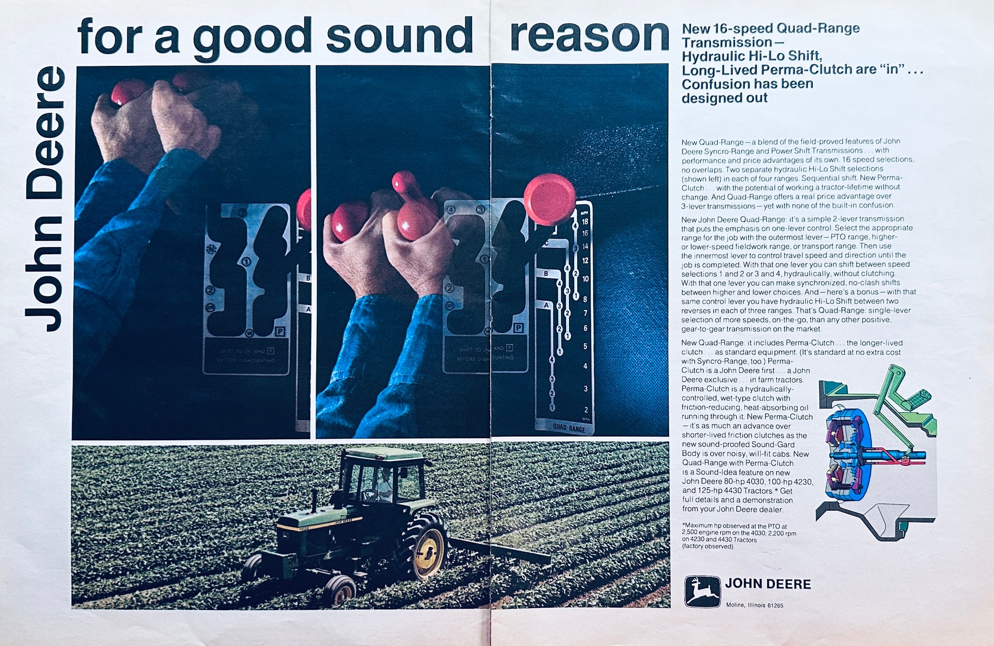 This original 2-Page magazine ad from 1972 is from a John Deere Ad Campaign I'm calling the Sound Reason. This ad measures @ 13 x 20" when carefully aligned and fully open as shown in the image. This particular ad talks about the John Deere 16 Speed Quad-Range Transmission on the 4230 and 4430 Tractors of the time.