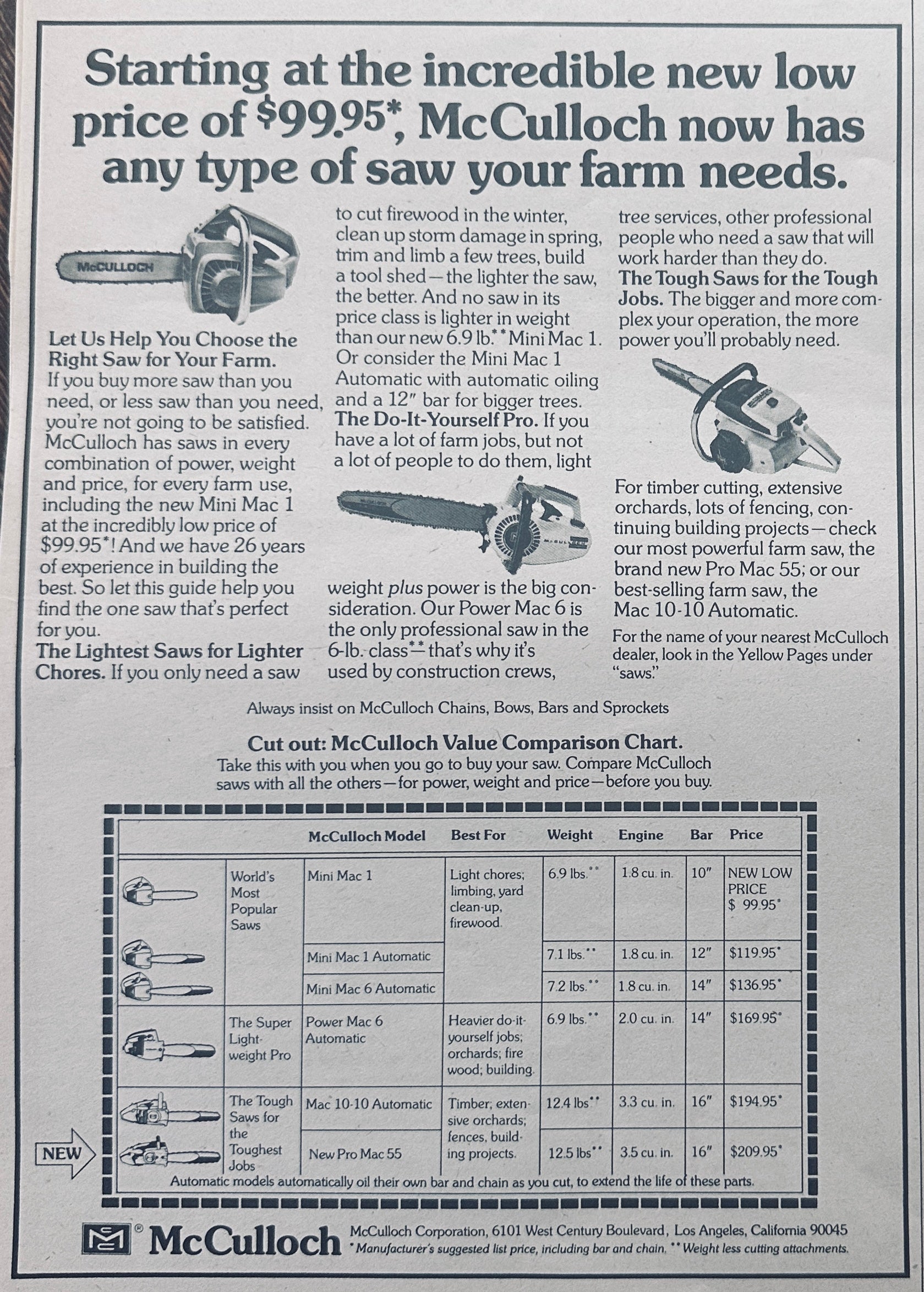 This original 8 x 10" magazine ad is untrimmed from its larger 10 x 13" page to feature the 1973 Line of McCulloch chain saws. 6 models are shown in the ad.