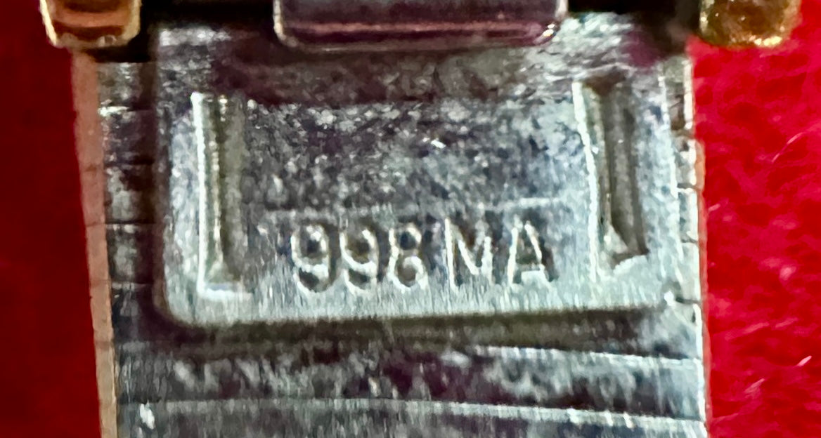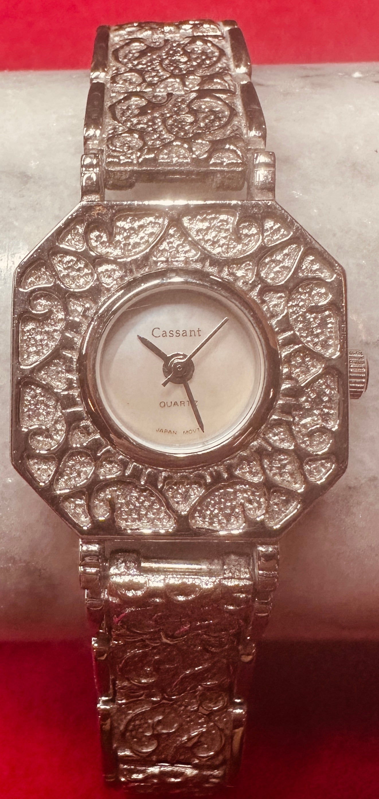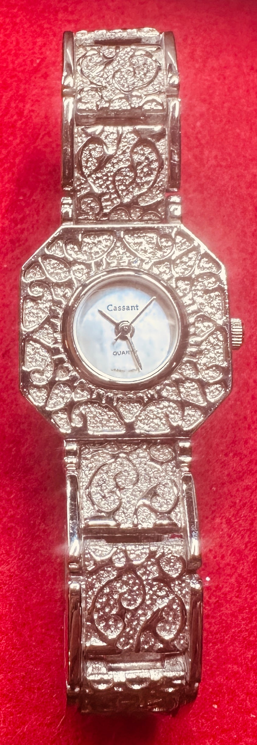 Watch 5: Very Attractive Victorian Floral Designed stamping to bezel and Band, Appears a Warm silver tone in nature. The watch face is marked Cassant, Quartz, Japan Movt. while the back plate is unmarked. The bracelet is made up of square stamped metal links, with a decorative clasp closure. Firs 5.5" wrist nicely.