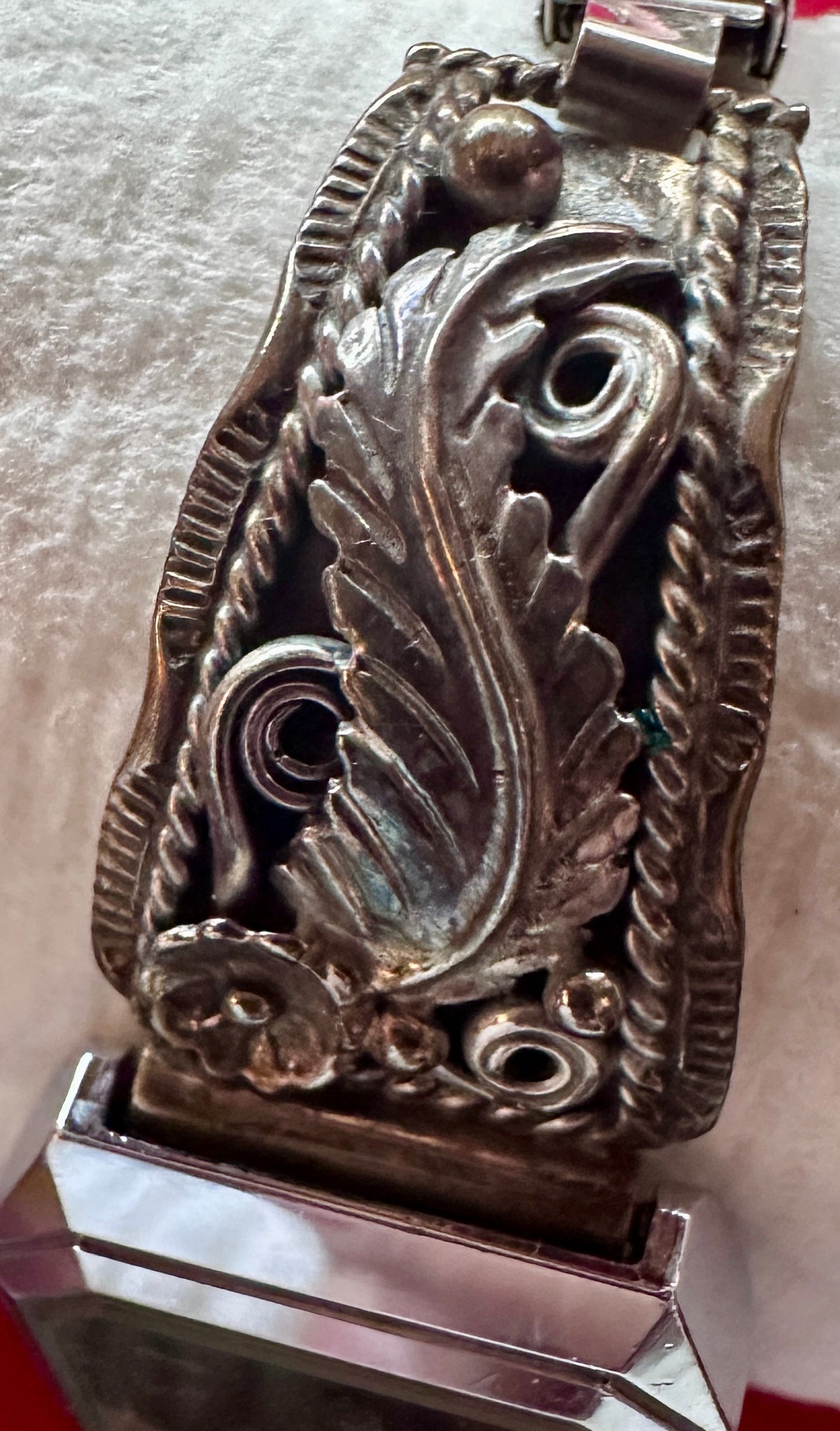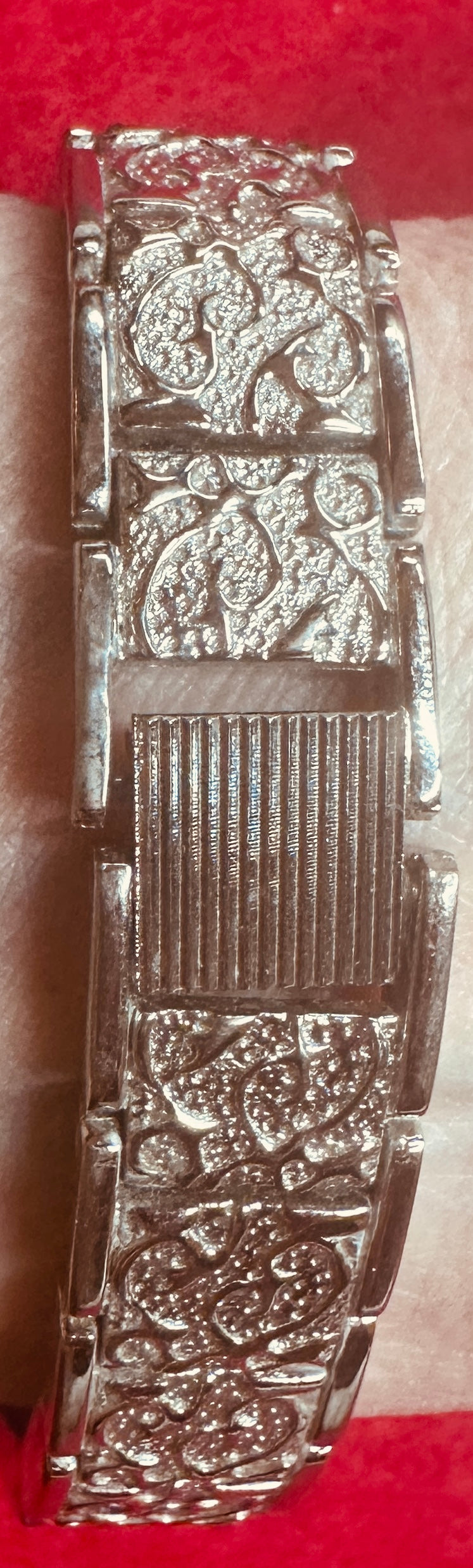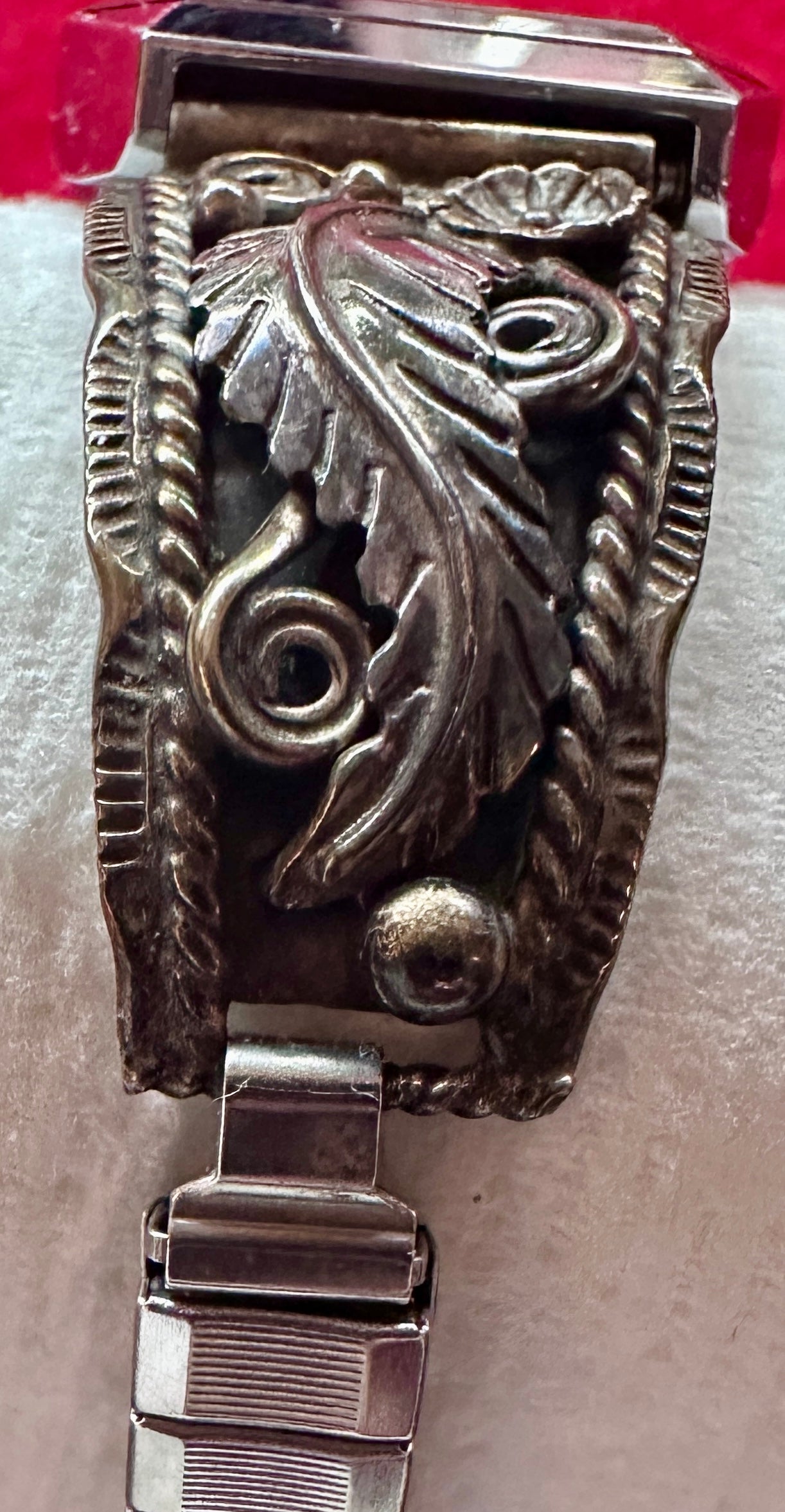 Watch 5: Very Attractive Victorian Floral Designed stamping to bezel and Band, Appears a Warm silver tone in nature. The watch face is marked Cassant, Quartz, Japan Movt. while the back plate is unmarked. The bracelet is made up of square stamped metal links, with a decorative clasp closure. Firs 5.5" wrist nicely.