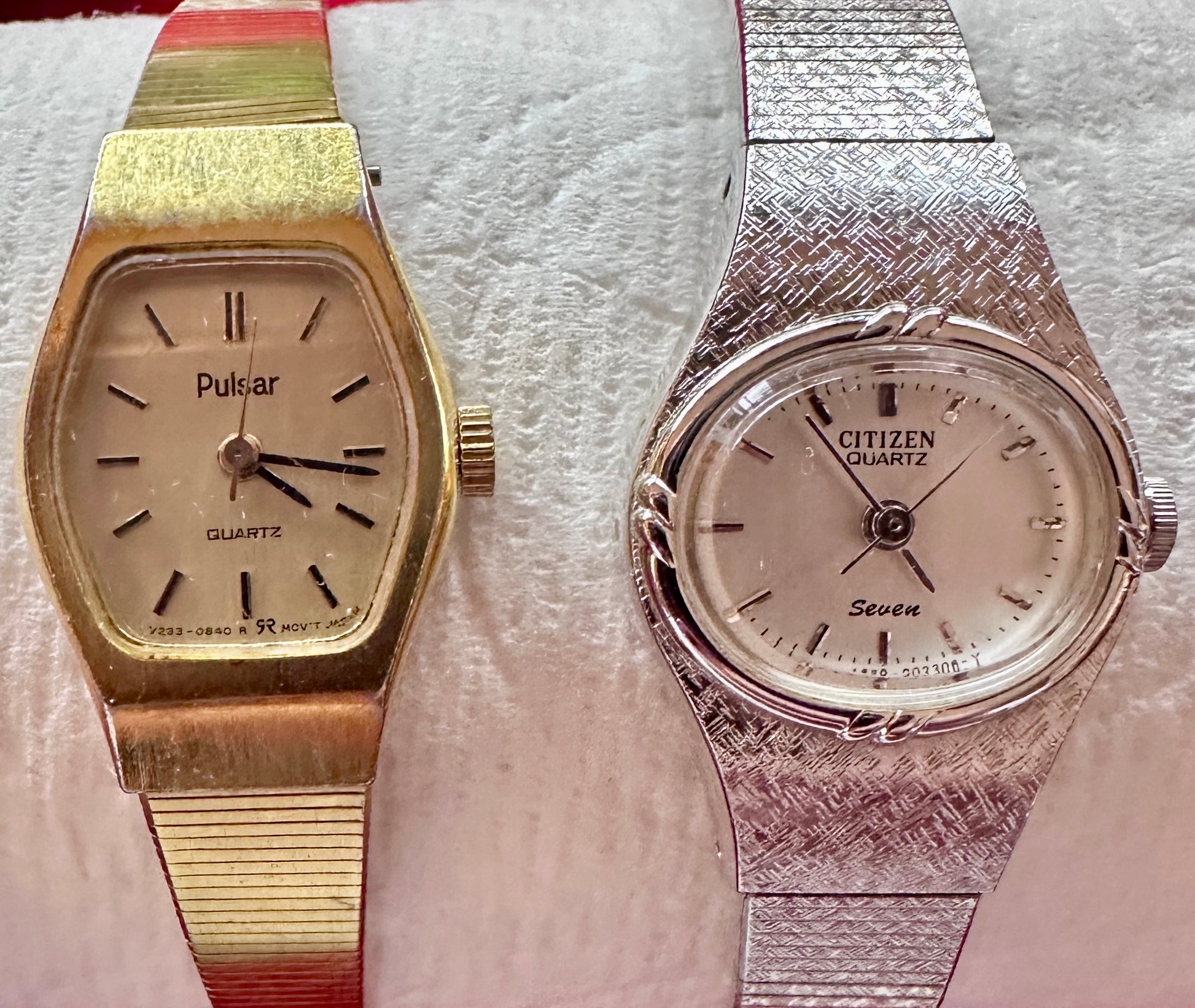 Watch 1: Goldtone bracelet band, Goldtone-Beige Dial, marked Pulsar, Quartz, V233-0840 R Movt Japan on face. @ 8 inches long. Backplate is marked Pulsar Base Metal Bezel Stainless Steel back v233-5320 R0 641718. Very dressy.