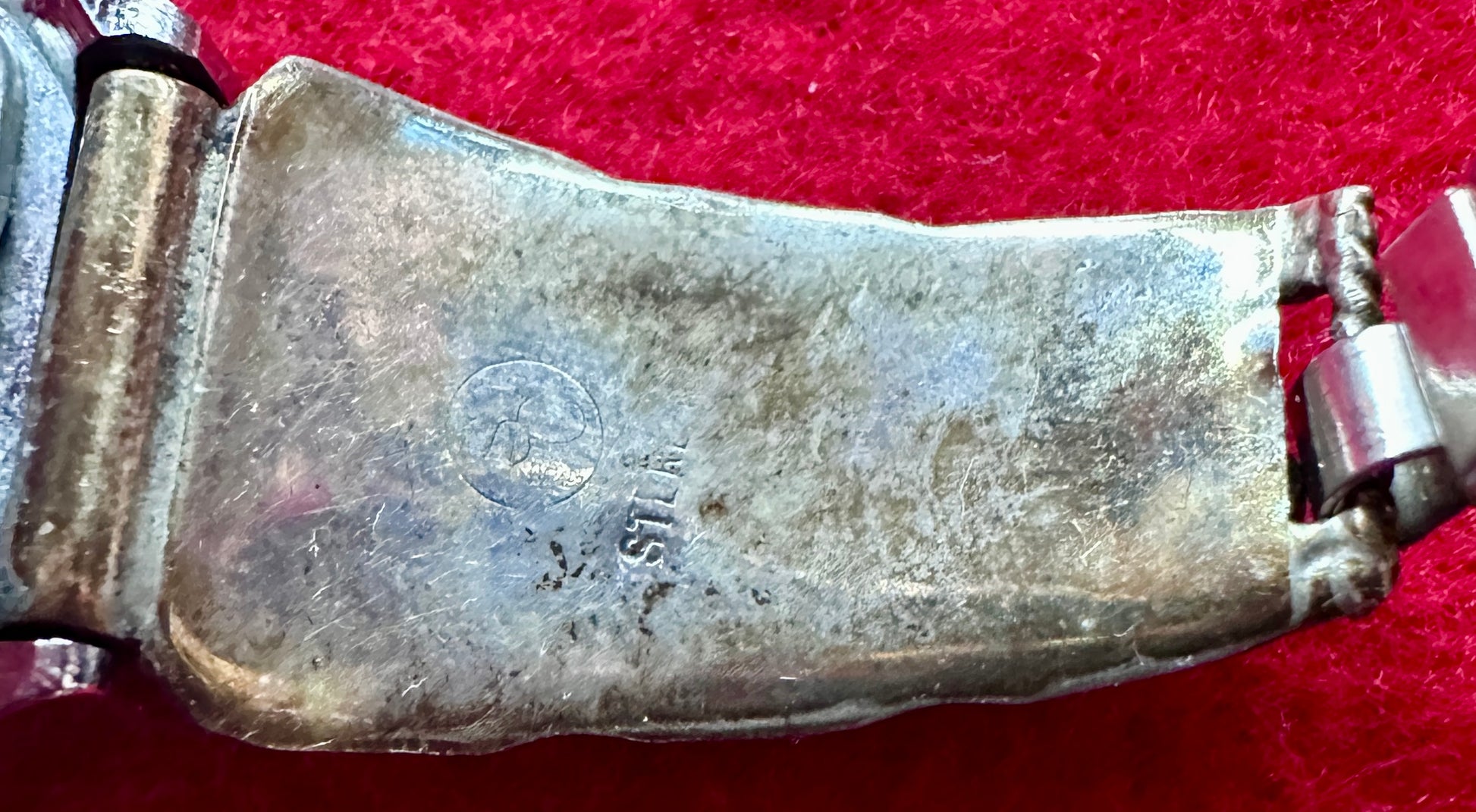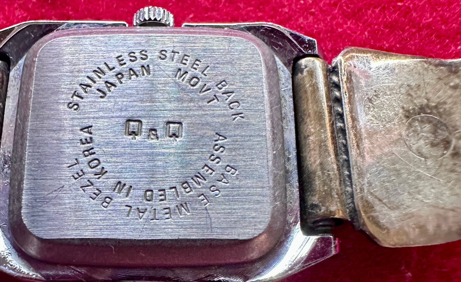 Watch 3: Silver and Silver tone Elongated Octagonal Watch with Black Face, Date feature at the 12 position, face marked Q&Q Quartz, Movt Japan Dial Taiwan 2035-915518 kt. Back plate is marked Stainless Steel Back, Japan Movt, Q&Q, Assembled in Korea, Base Metal Bezel. The side stampings are in silver that has marks on the back and is tarnished on the stamped side. The lower portions is silver tone expansion links.