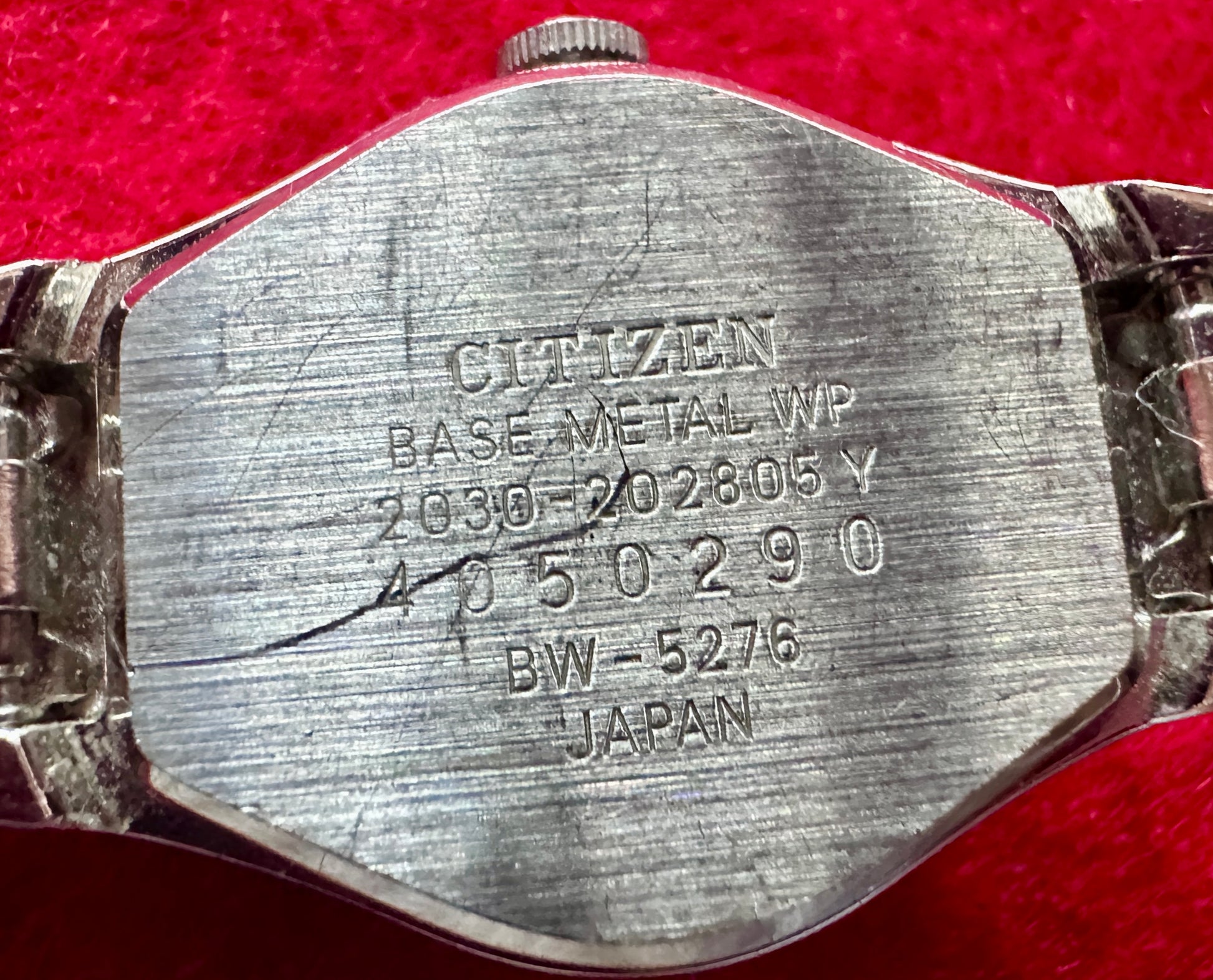 Watch 2: Silverstone bracelet band, oval watch with white face, marked Citizen Quartz Seven with some numbers along the bottom dial that can only be partially read 203300-Y. The back plate is stamped Citizen Base Metal WP 2030-202805Y 4050290 BW-5276 Japan.