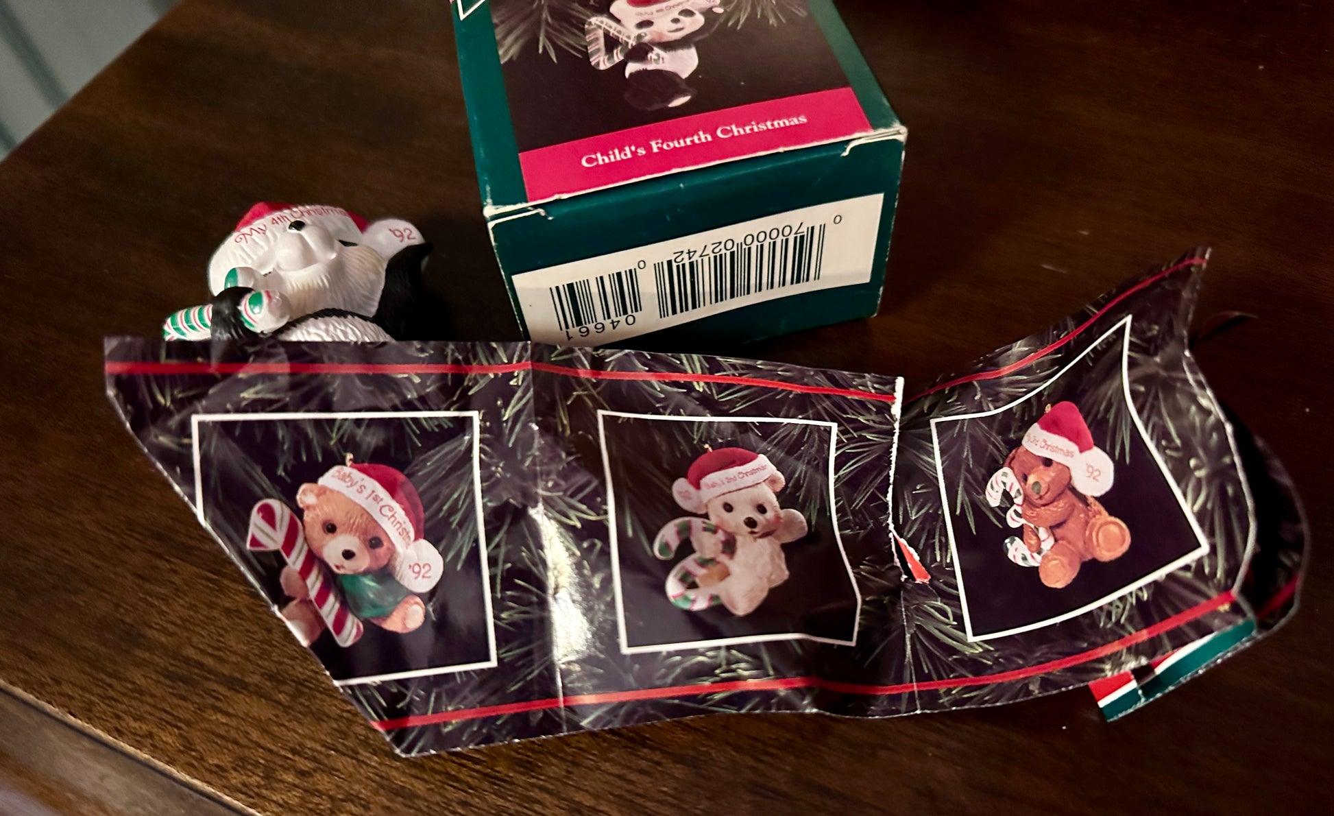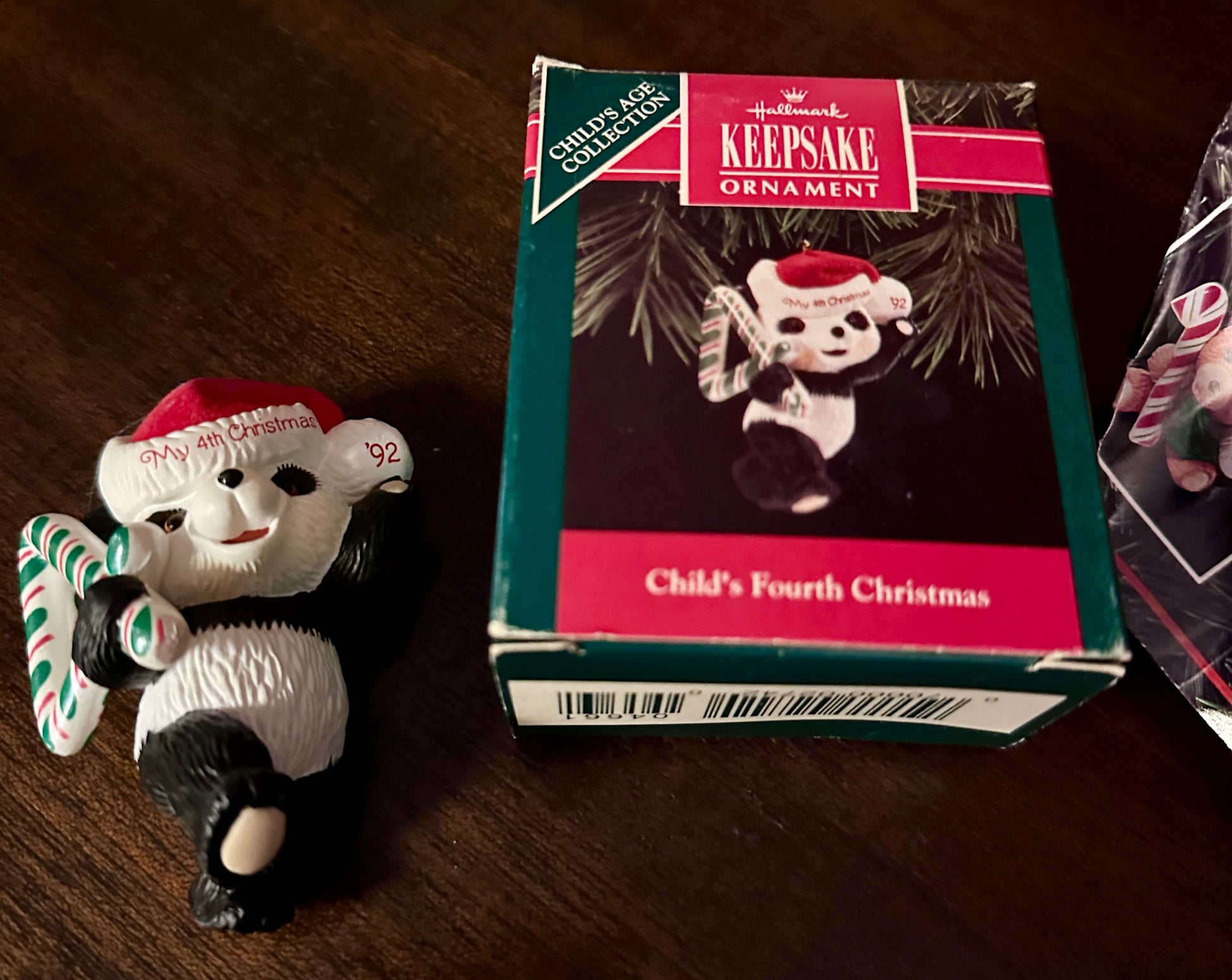 This original Hallmark ornament was part of the Child's Age Collection and symbolized a Child's 4th Christmas. Ornament shows a Panda bear carry the number 4 on his shoulder with his Santa Cap detailing the year and the fact that it was his 4th Christmas. Price on box was $6.75
