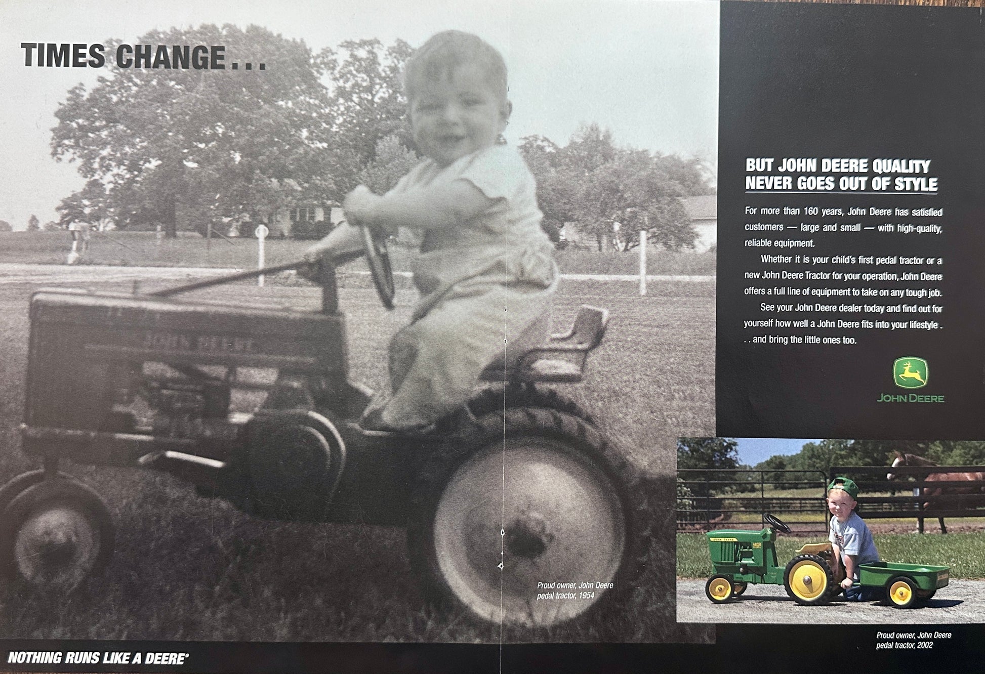This original 11 x 17" centerfold magazine ad from 2003 features a child in 1954 riding his John Deere Pedal tractor and an inset of another child in 2002 riding his newer version with the tagline John Deere quality never goes out of style!