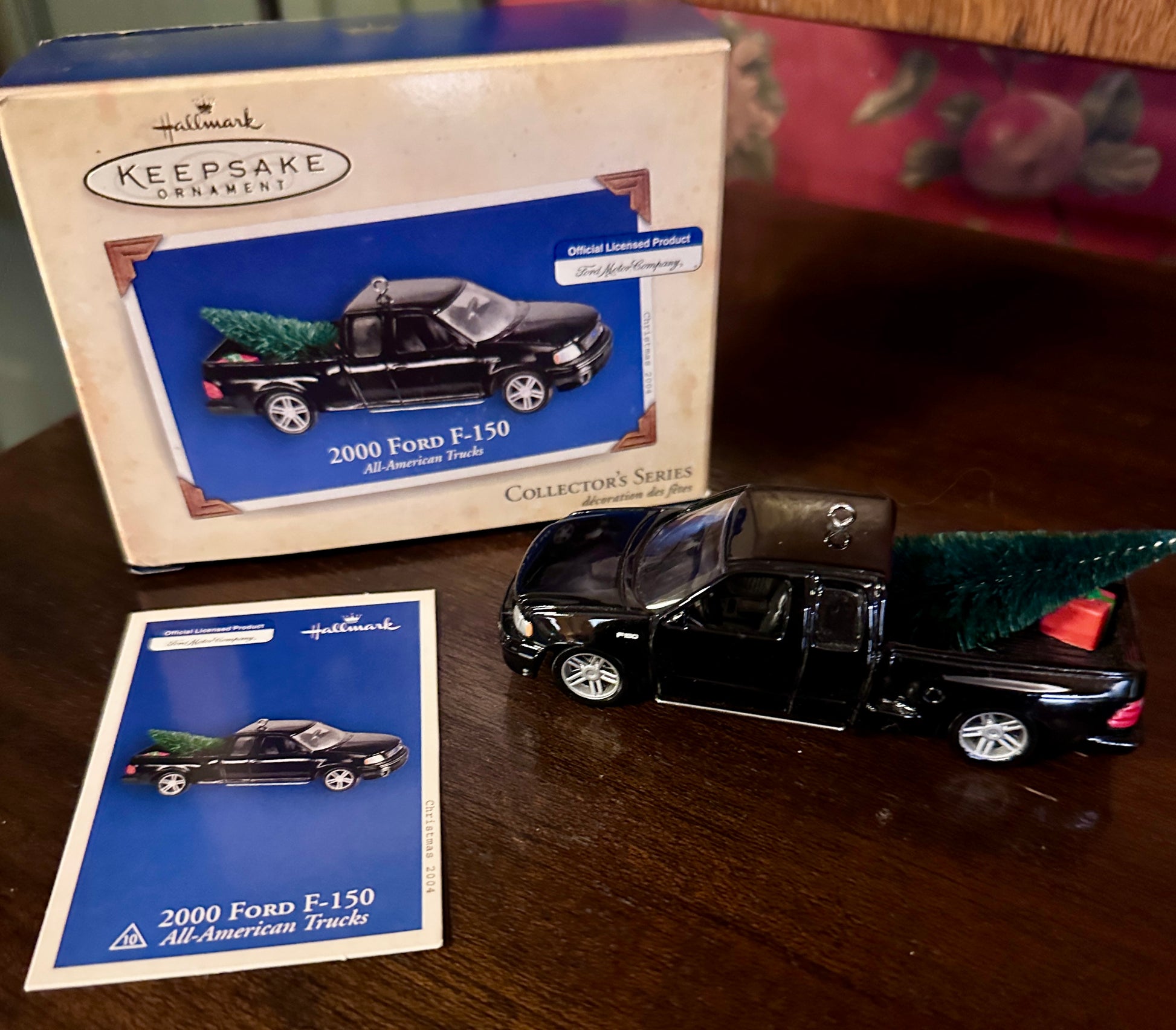 This original Hallmark Keepsake ornament is dated 2004 and features its original box, collector card and actual black die-cast Ford F-150 hauling a Christmas tree in the bed. Box and ornament are in excellent condition but have seen tree time in the past seasons. Original prices was $14.95 when new.