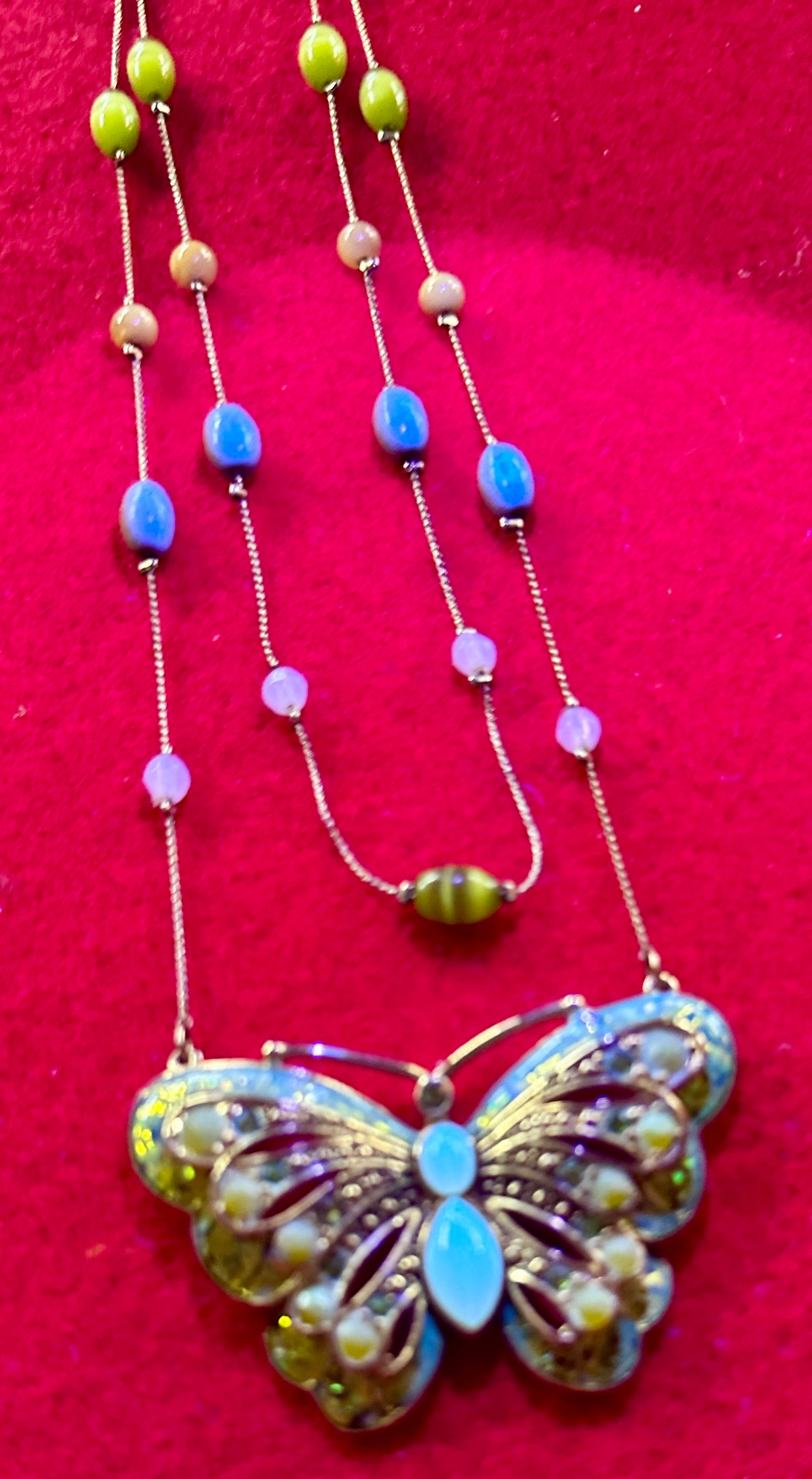 This vintage estate jewelry necklace consists of 2 beaded chains with a delicate metal and stone butterfly pendant. Under normal lighting the beads are Clear, Green, Taupe color, but under black light many fluoresce a beautiful blue including the butterfly's body. Necklace has a c clamp type closure. This is truly a unique piece.