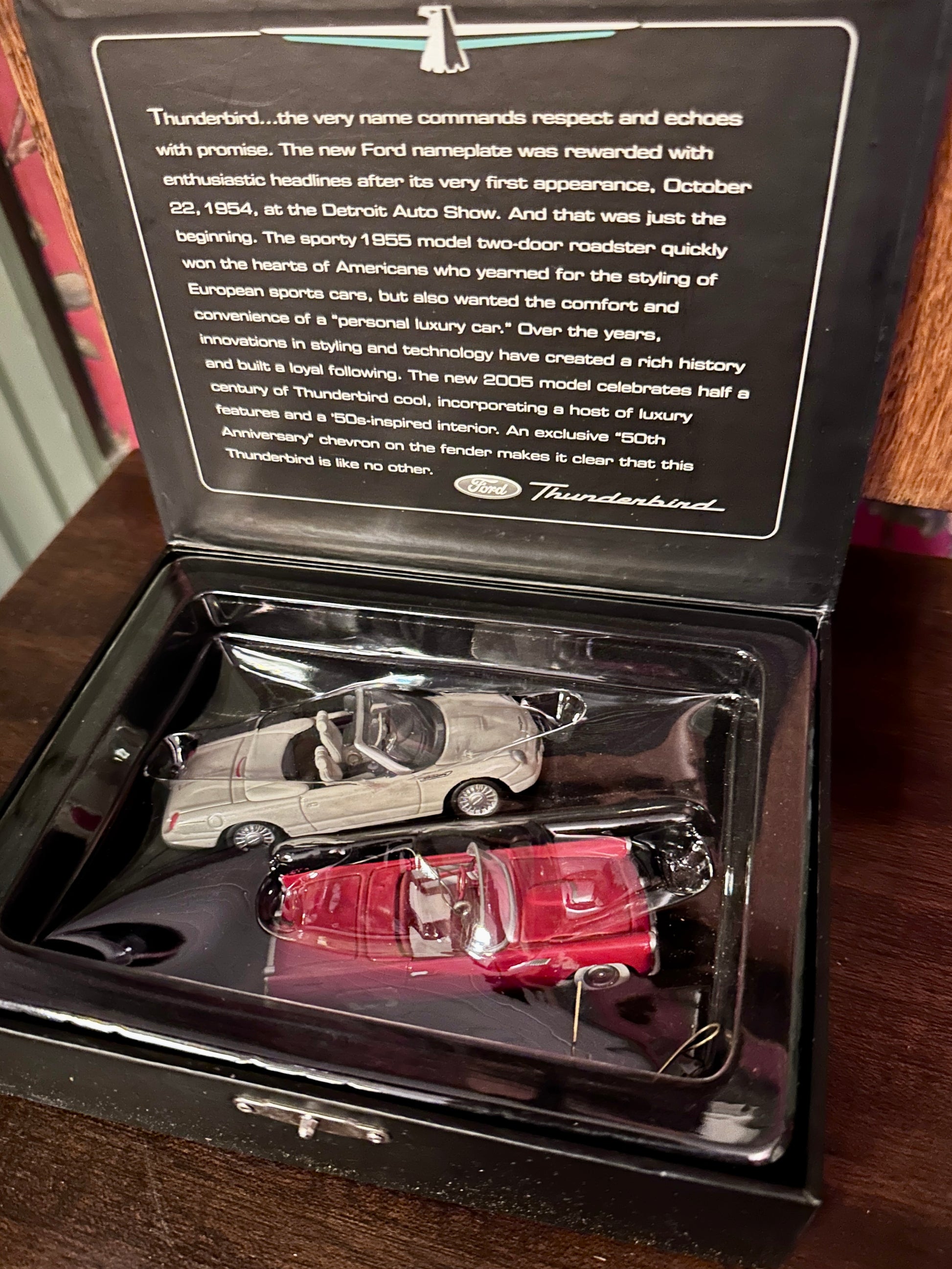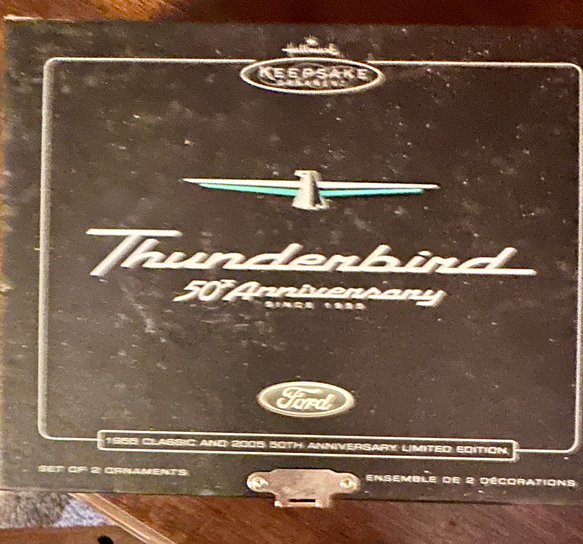 This original 2005 Hallmark Keepsake Box Set Ornament was made in honor of the 50th anniversary of the Ford Thunderbird Automobile Model. The set features a heavy printed box with aluminum latch, and 2 die cast models on the inside. The red model is a 1955 Thunderbird, the one that started it all and the White is a 2005 reimagined Thunderbird for the 21st century. The outside of the box is slightly scuffed, the inside is still as it was in 2005 when purchased. These ornaments have never been hung. The original 2005 price printed on the box was $24.00.