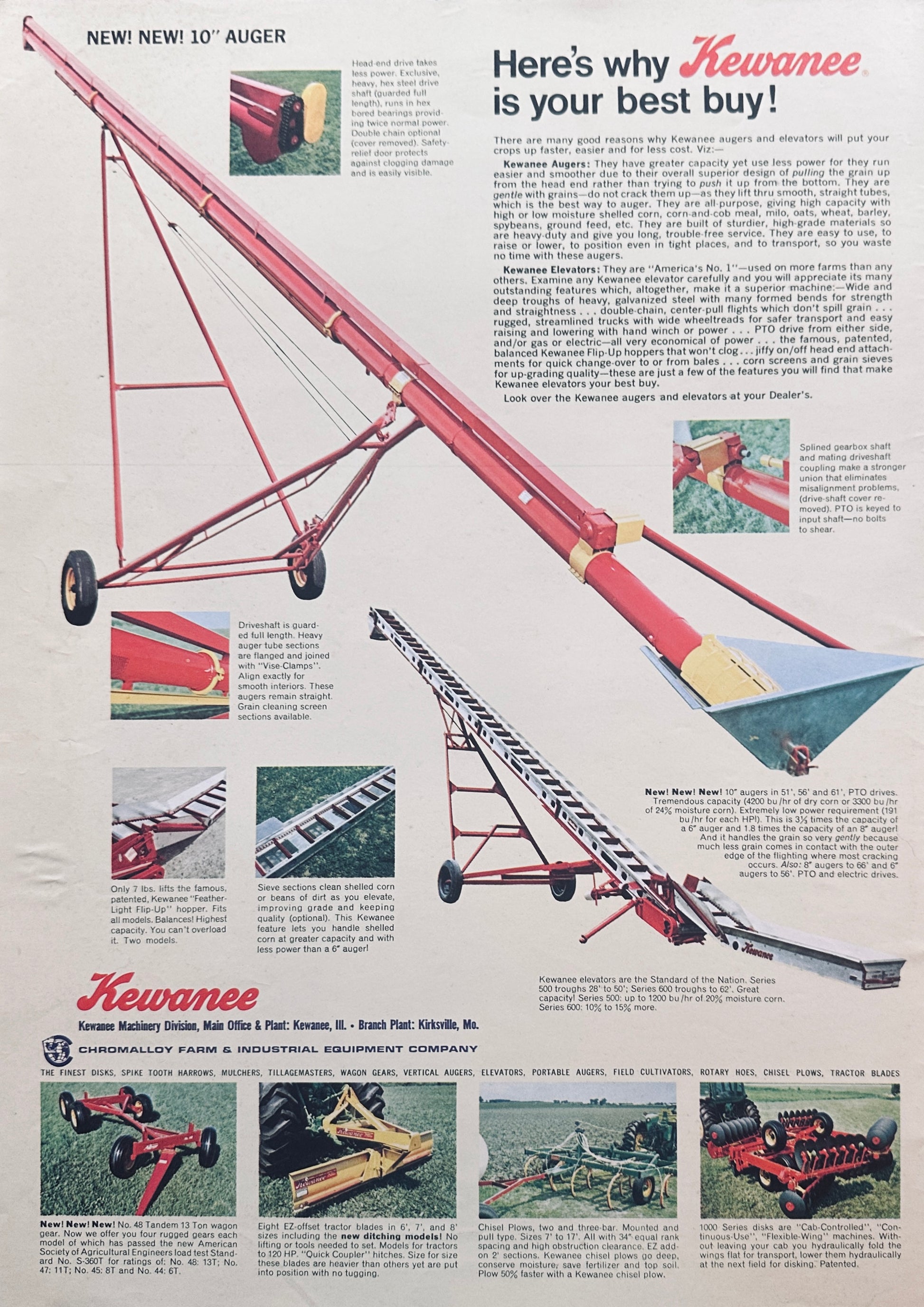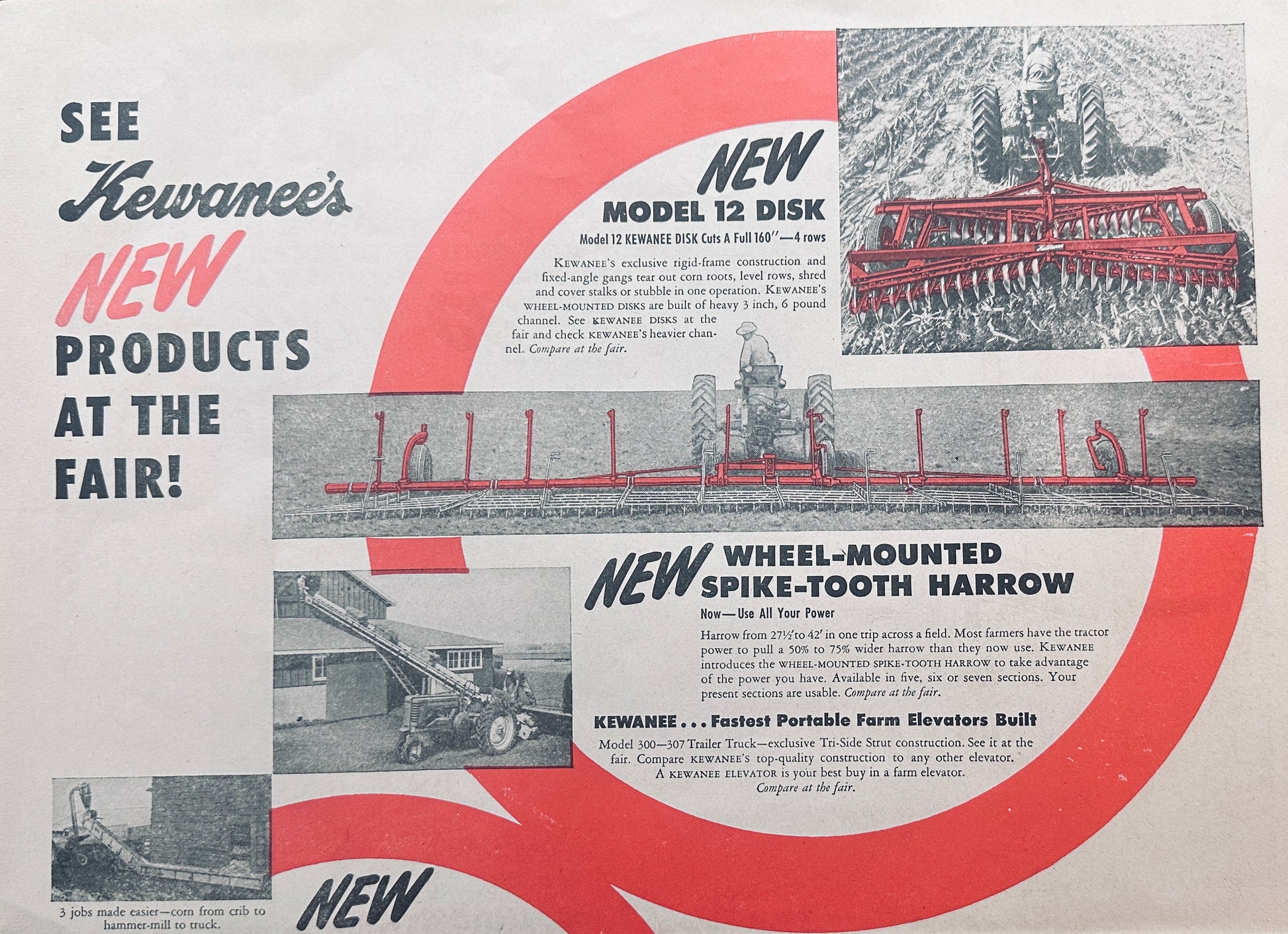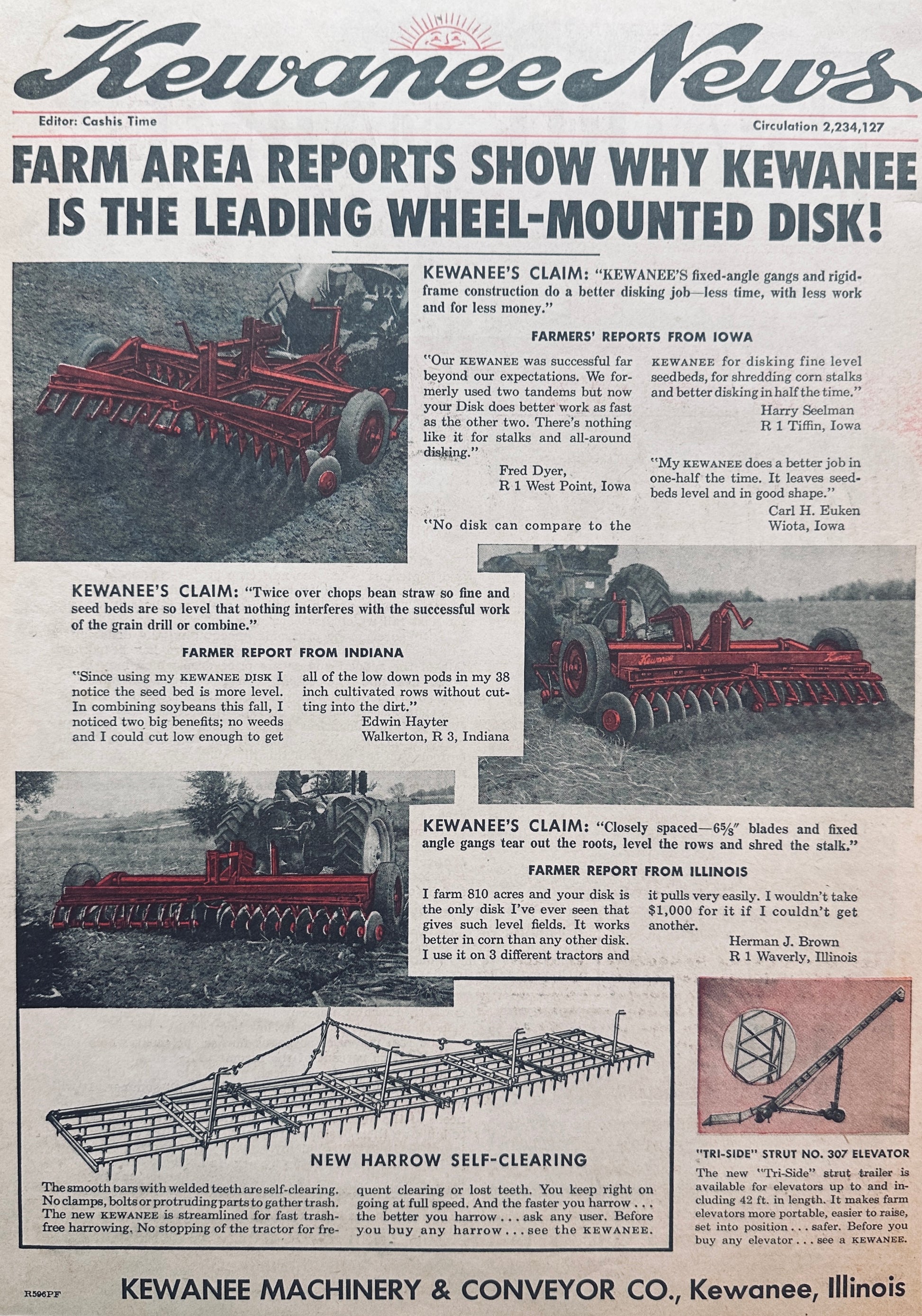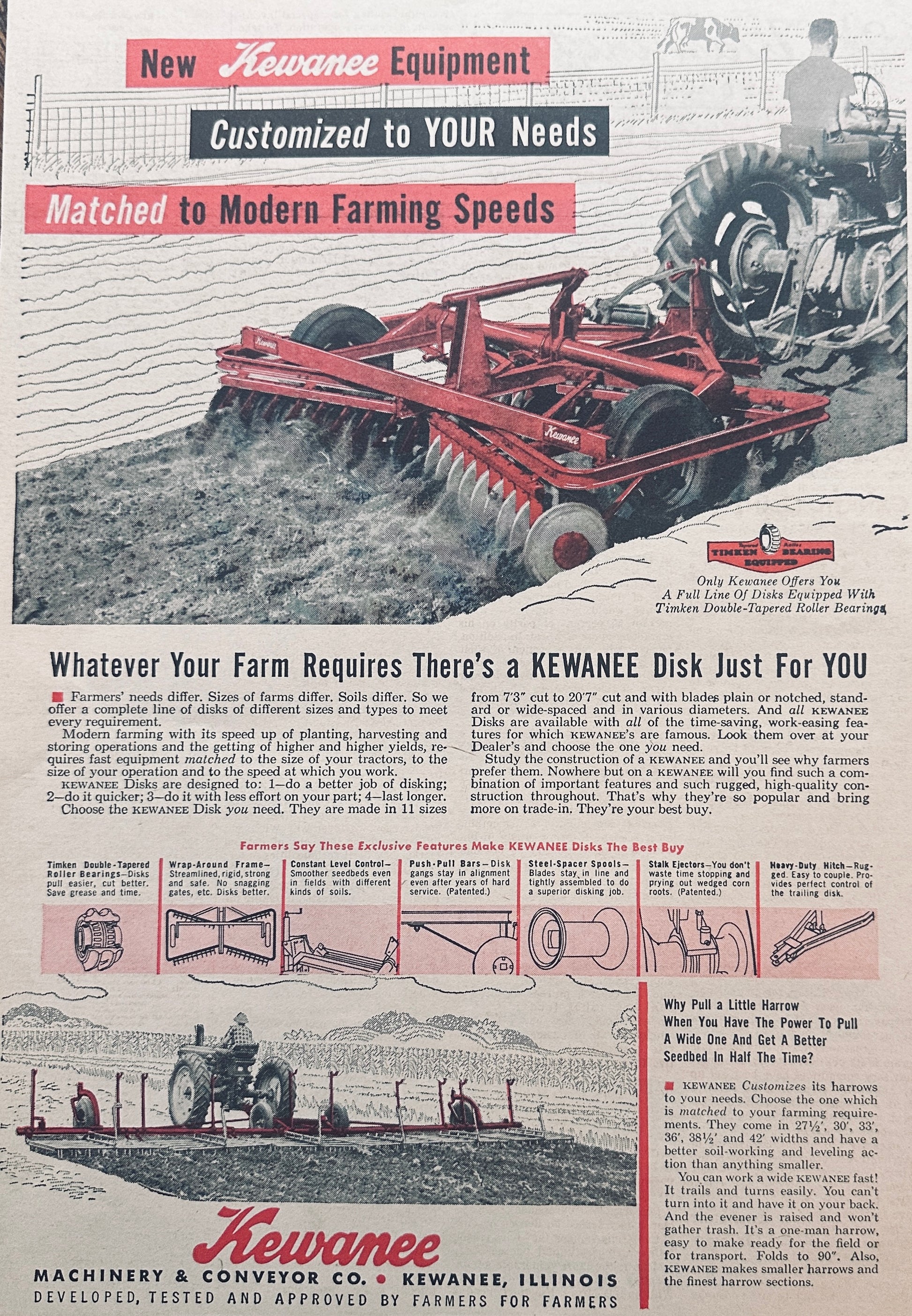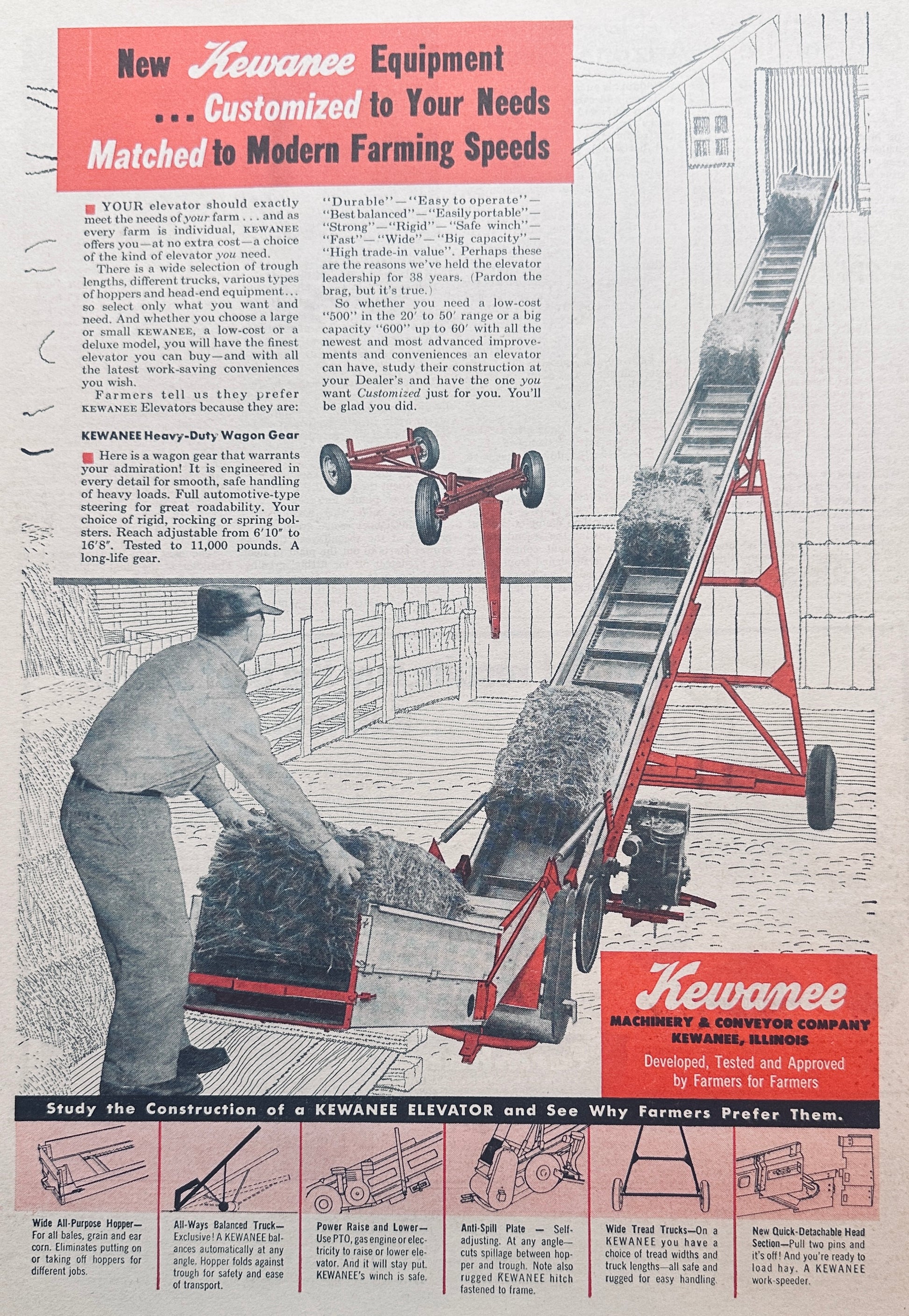 This lot of (5) original magazine ads each measure 10 x 13" and feature Kewanee farm equipment. The earliest ad is 1954, there are three 1959 and the last one is from 1975.