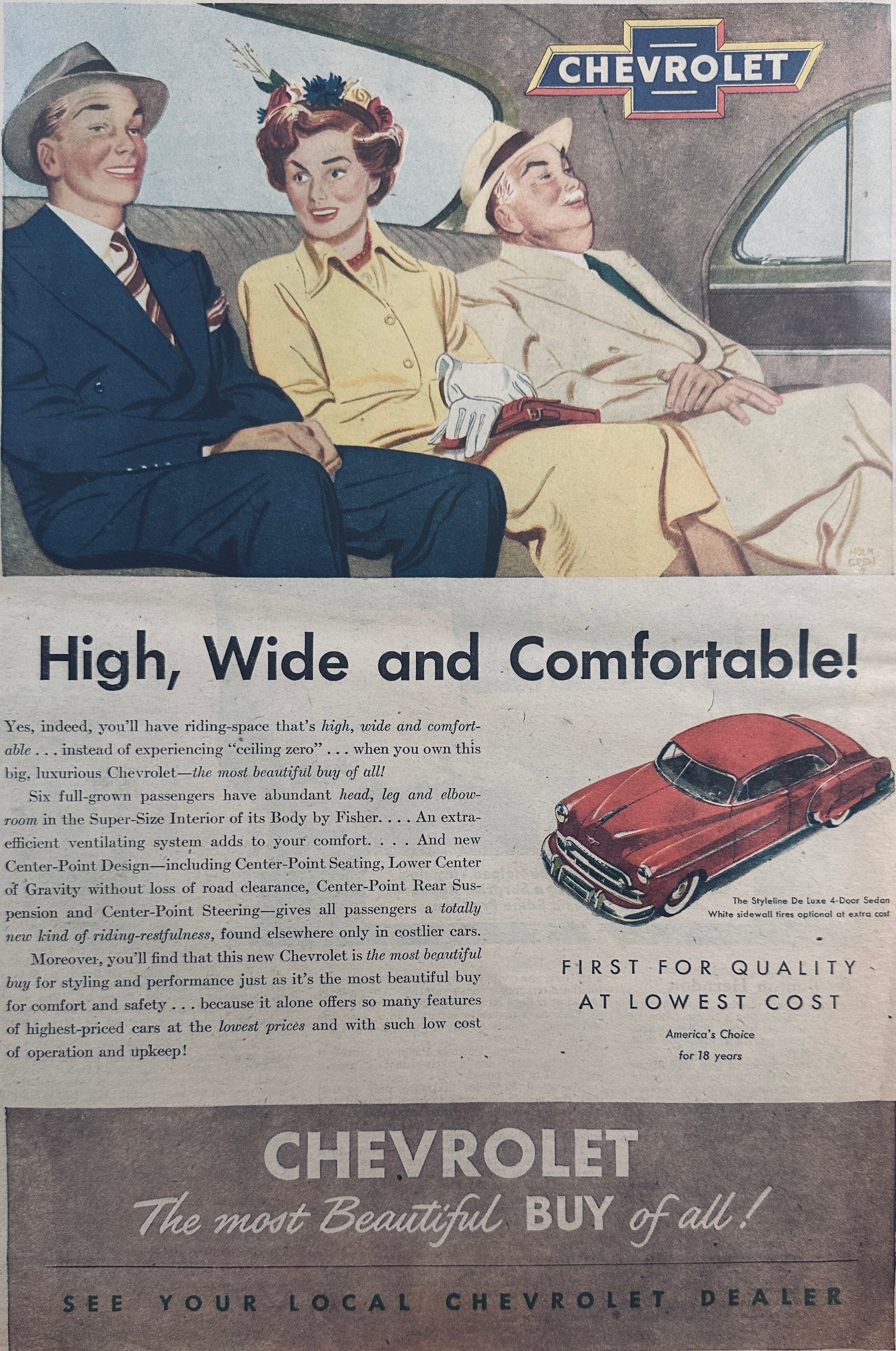 This original 11 x 15" magazine ad features the 1949 Chevrolet Styleline DeLuxe 4 Door Sedan in Red showcasing the roominess of the back seat! High, Wide & Comfortable. Period Patina.