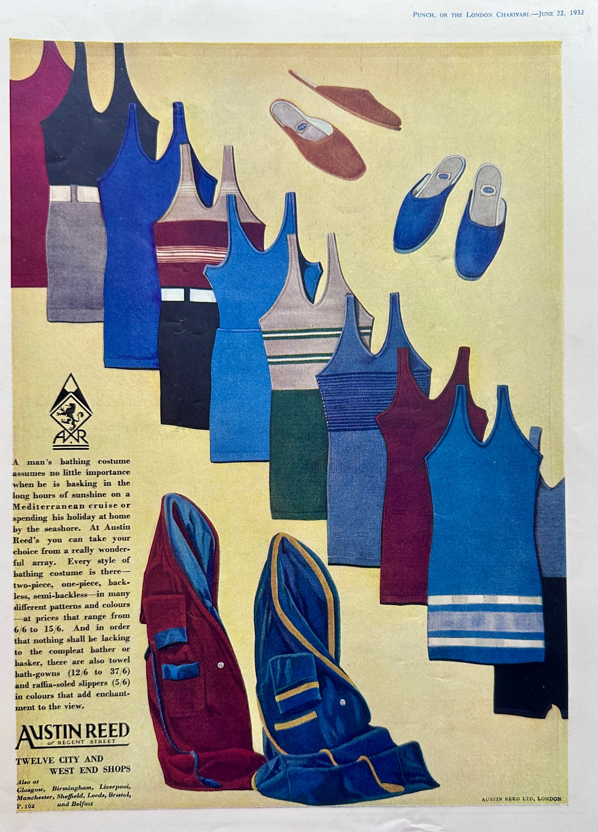This original 8.5 x 11" magazine ad from 1932 ran in "The Punch, or London Charivari" magazine to showcase Player' Navy Cut Cigarettes and Austin Reed's Men's Bathing "Costumes". Beautiful, rich period colors on both ads, both would be conversation starters for sure.